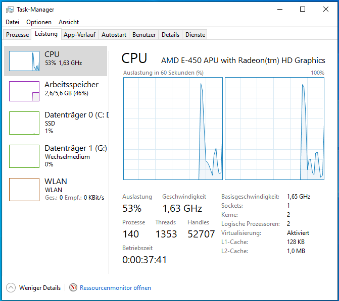 ich habe hier ein Asus X53B, ein alter Schinken mit einem schwachen AMD E450+6GB Arbeitsspeicher.
