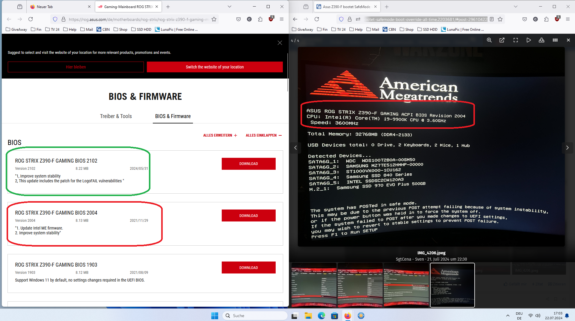 2. bei jedem PC Start will er ins BIOS und muss darüber boot override nutzen. Das passiert immer ein paar Wochen bis es wieder mal kurz geht, dann wieder nicht. Kein Muster erkennbar an welchen Updates es liegt.