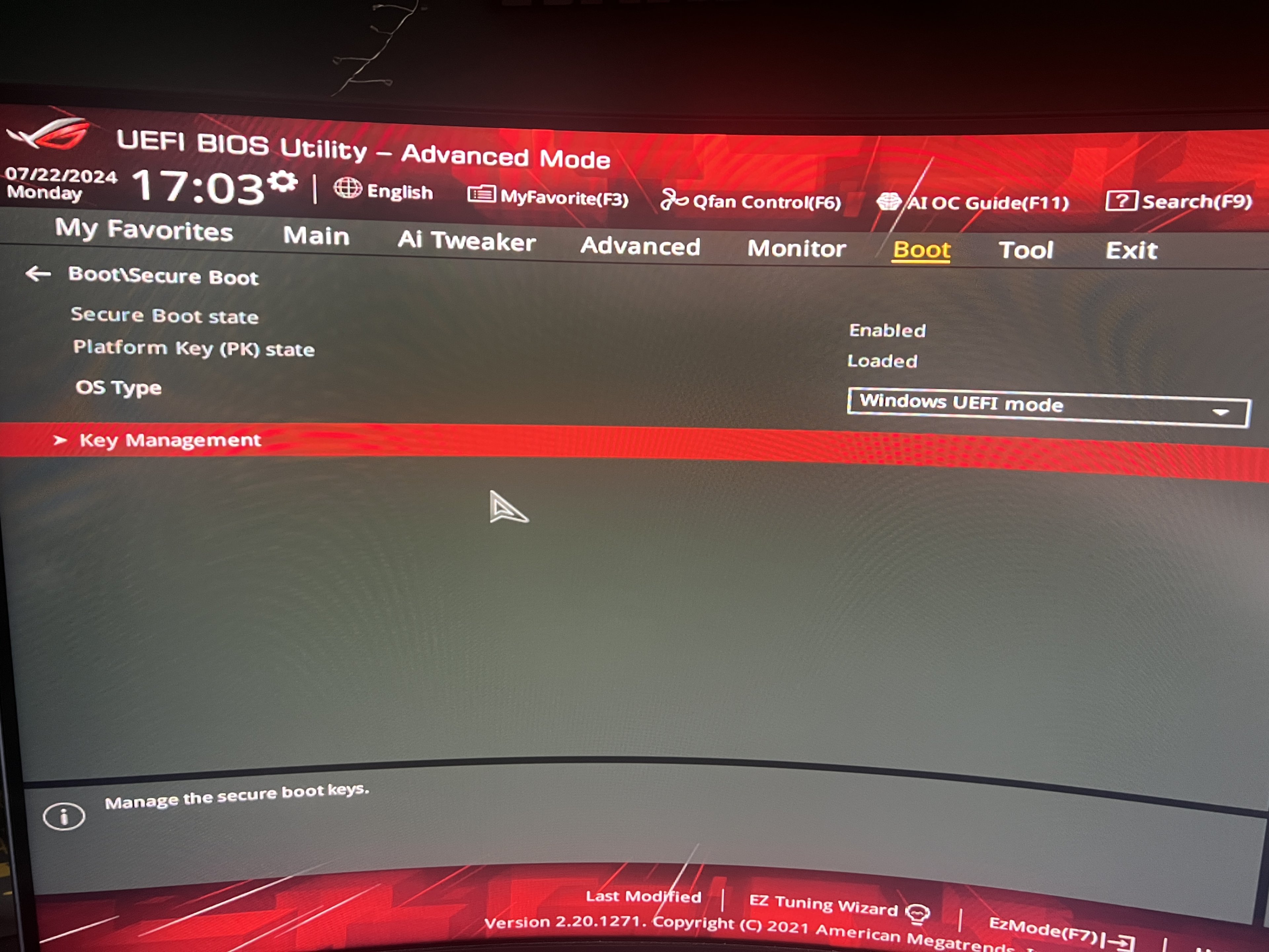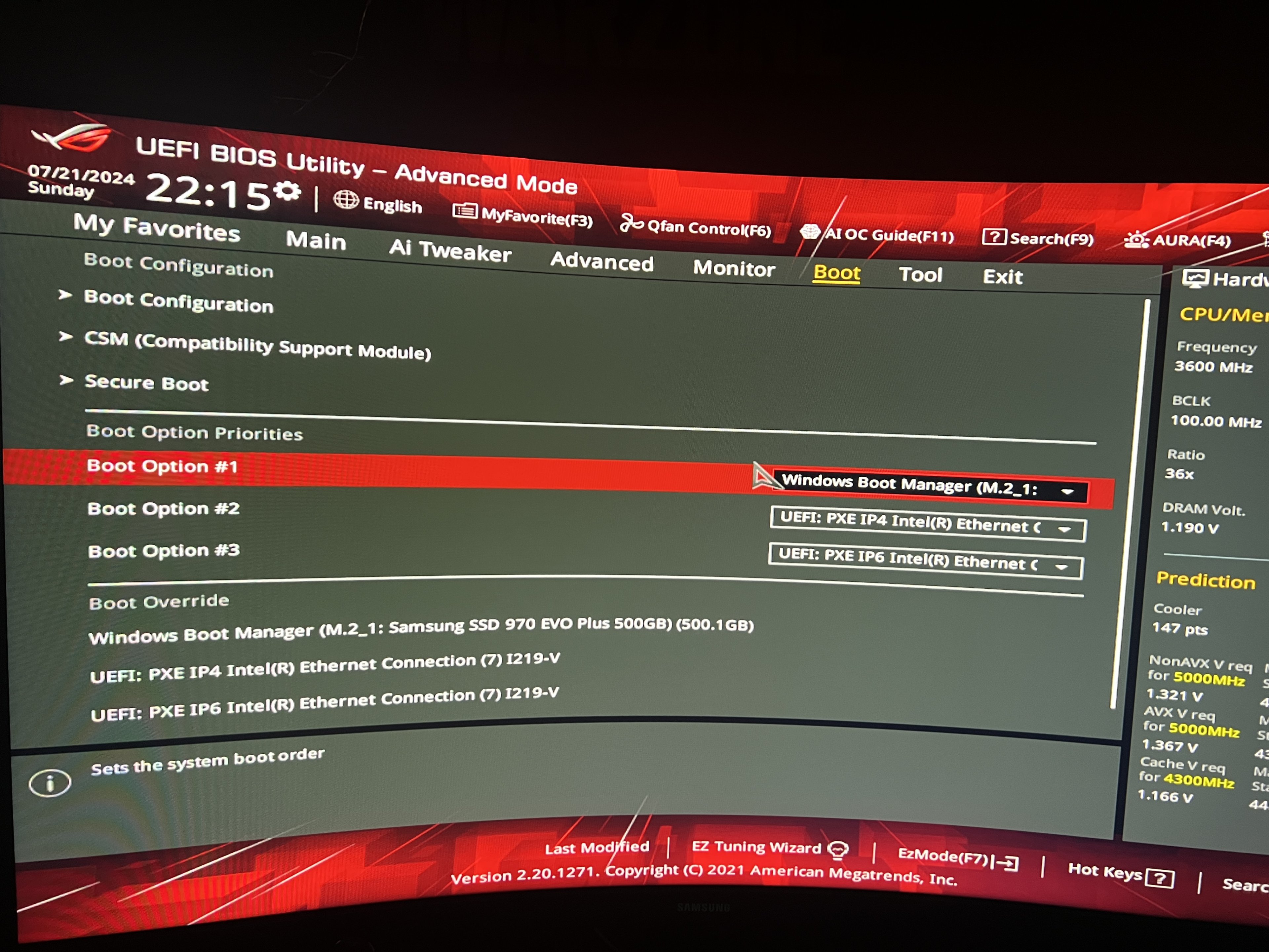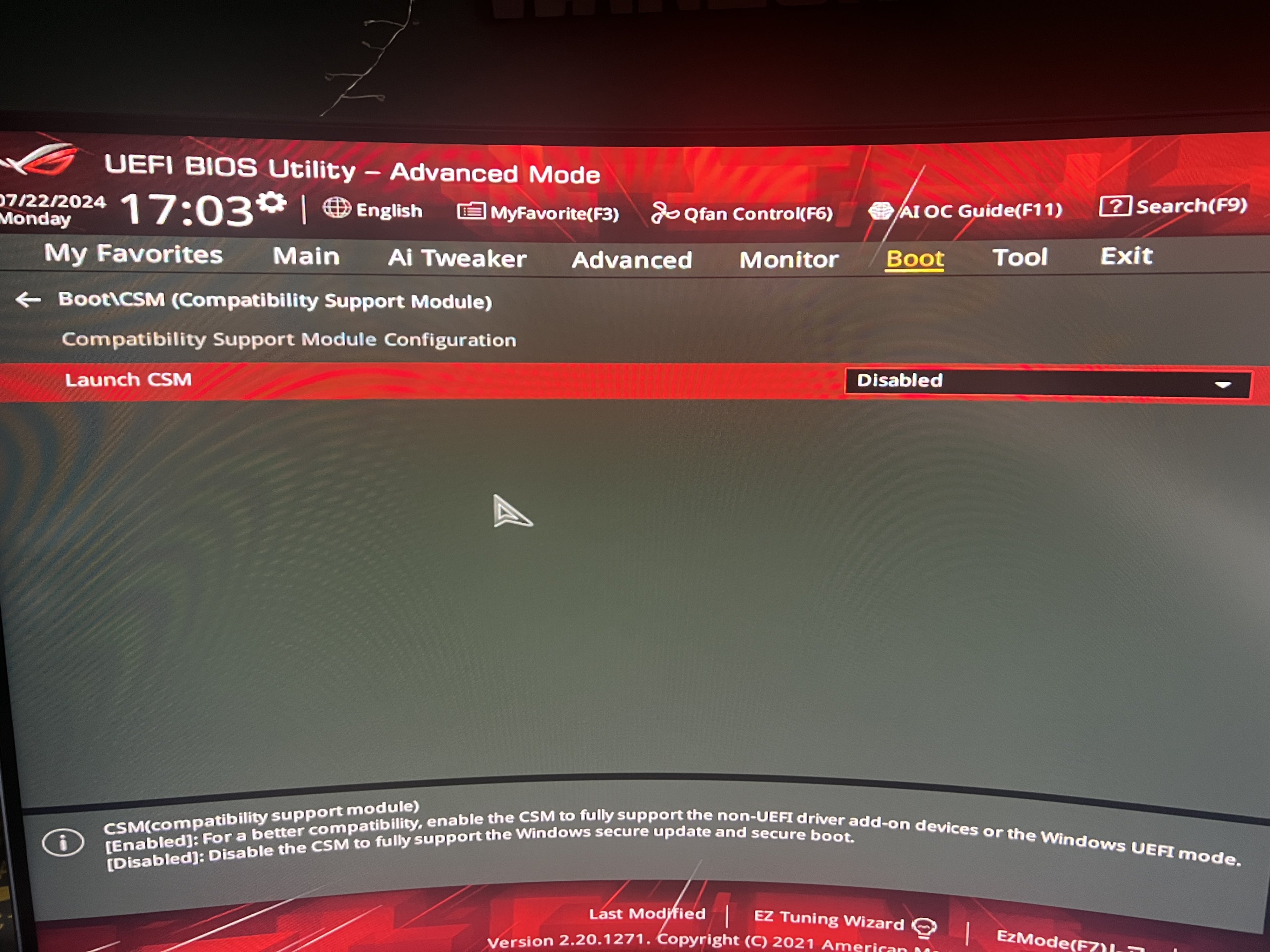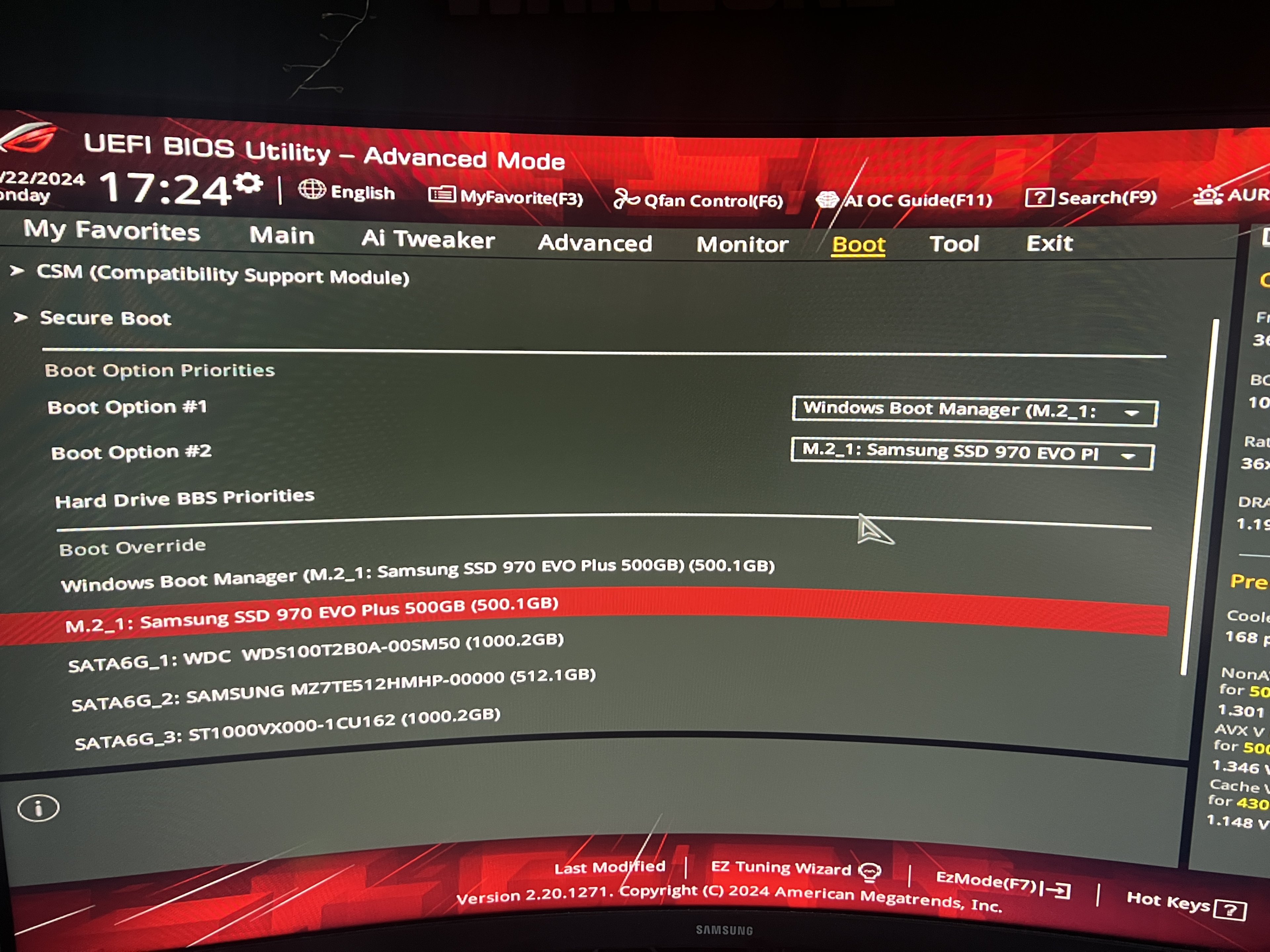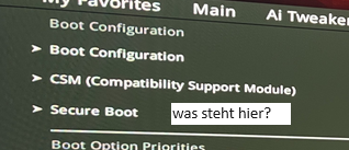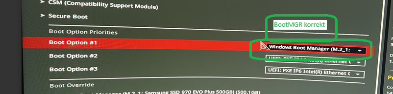 Habe Win11 64Bit, TPM und alles aktiv. BIOS aktuellste Version die abrufbar ist. Das Problem war mit dem bios auch schon mal behoben, jetzt ist es wieder da. Hab mal einige Screenshots der wichtigsten Infos aus dem BIOS. Kennt jemand diese Fehler? Es scheint, als ob das System nicht weiß wo es booten soll und postet dann den Safemode. Hab sonst kaum bis wenige Probleme. Auch alles an externen Geräten bis auf Maus und Tastatur (Logitech Wireless G Pro X und G Pro TKL) sind abgesteckt die per usb blockieren könnten. Weiß nicht mehr weiter und es nervt, es geht aber ansonsten alles normal, nur der Umweg nervt.