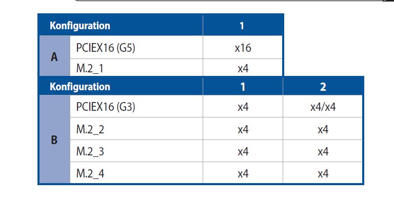 Das Thema mit den Lanes find ich eh total verwirrend. Warum kann man nicht zb. alle ports mit x16 elektrisch verbinden und dann bei einer X16 5.0 GPU wird der 2te entweder deaktiviert oder läuft im 5.0 x8 x8 Mode. Und dann bei Abwärtskompatibilität zb. 4.0 x16 x16 weil 5.0 x16 = 4.0 x32 bzw x16 + x16