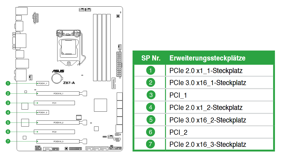 Nun mein Problem: Das Z87-A hat zwei PCIe x16 Steckplätze. Wenn ich die Grafikkarte ASUS RX 560 ROG STRIX in den oberen, goldenen PCIe x16_1Platz stecke, bleibt darüber kein Platz für die Tochterkarte meines Soundblaster ZXR. Wenn ich die Soundkarte direkt unter der Grafikkarte installiere, ist die Luftzirkulation der Grafikkarte stark eingeschränkt. Mit welchem Leistungsverlust muss ich rechnen, wenn ich die Soundkarte in den obersten PCIe x1_1Slot stecke und die Grafikkarte in den unteren, schwarzen PCIe x16_2-Slot?