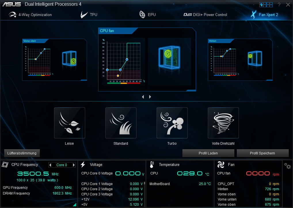 Ich habe vor kurzem ein ASUS Z87 Pro verbaut. Alle Lüfter sind mit 3-Pin am MB angeschlossen und lassen sich perfekt über FanXpert 2 regeln. Die Noctua D14 Lüfter sind über einen Y-Adapter als CPU-Fan angeschlossen. Auch deren Regelung funktioniet soweit ganz gut. Das Problem ist jedoch, dass beim Start des PCs irgendwie ein falsches (eigentlich unmögliches) Lüfterprofil geladen wird, obwohl ich das nicht abgespeichert habe. Das sieht man hier: