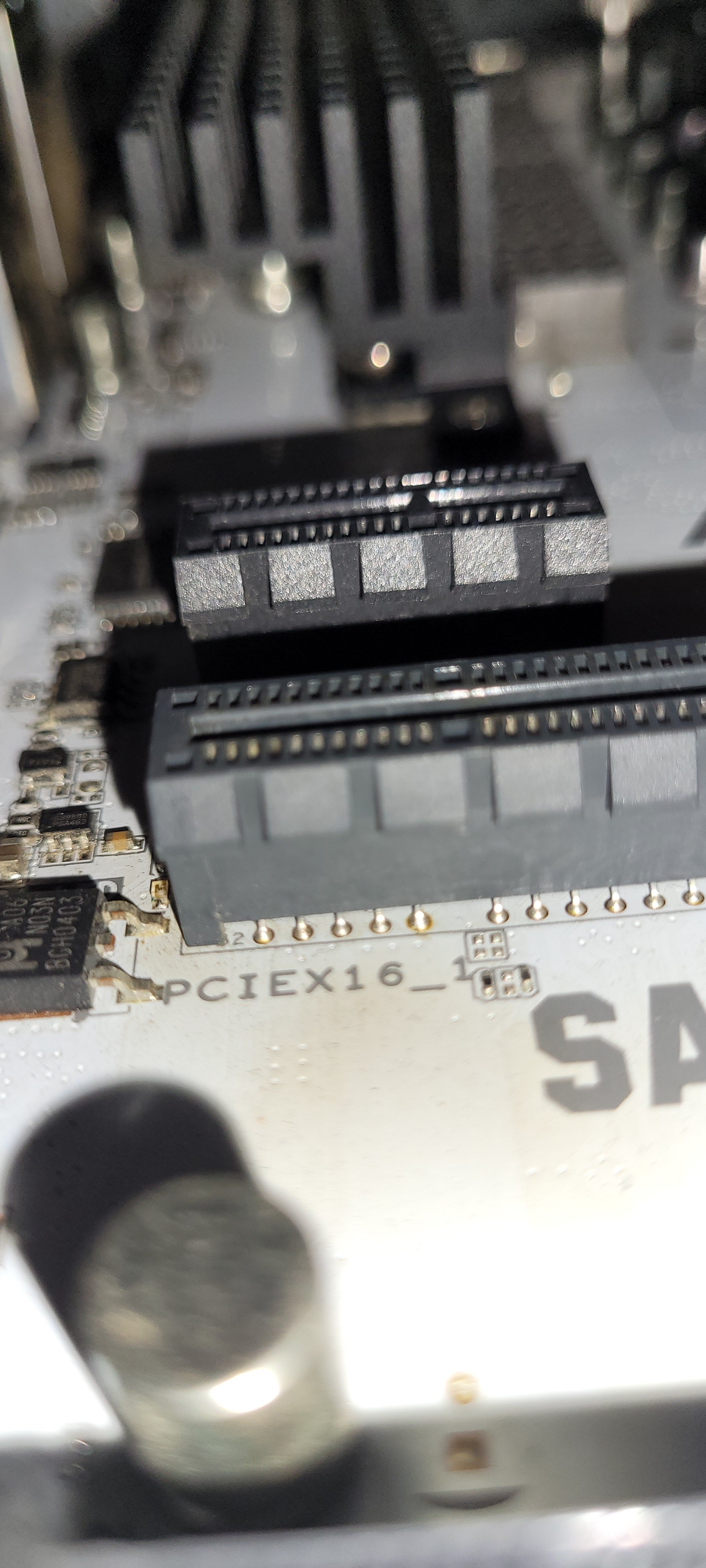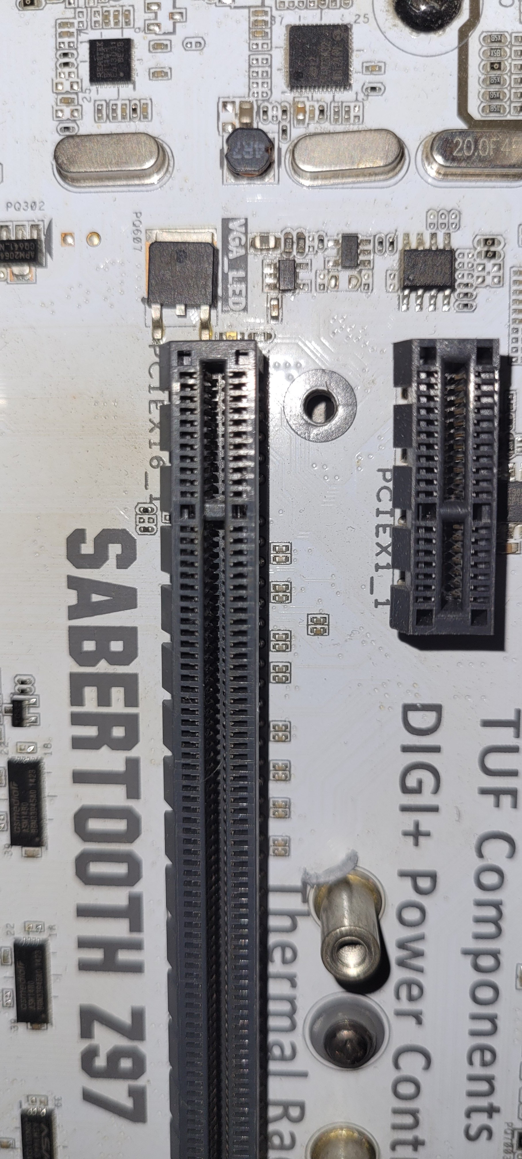 Nach genauem Prüfen der Hardware fiel mir auf das der 5te Pin am kurzen Teil des Slots an meinem PCIe x16 Durchgebrannt ist (Siehe Bilder).