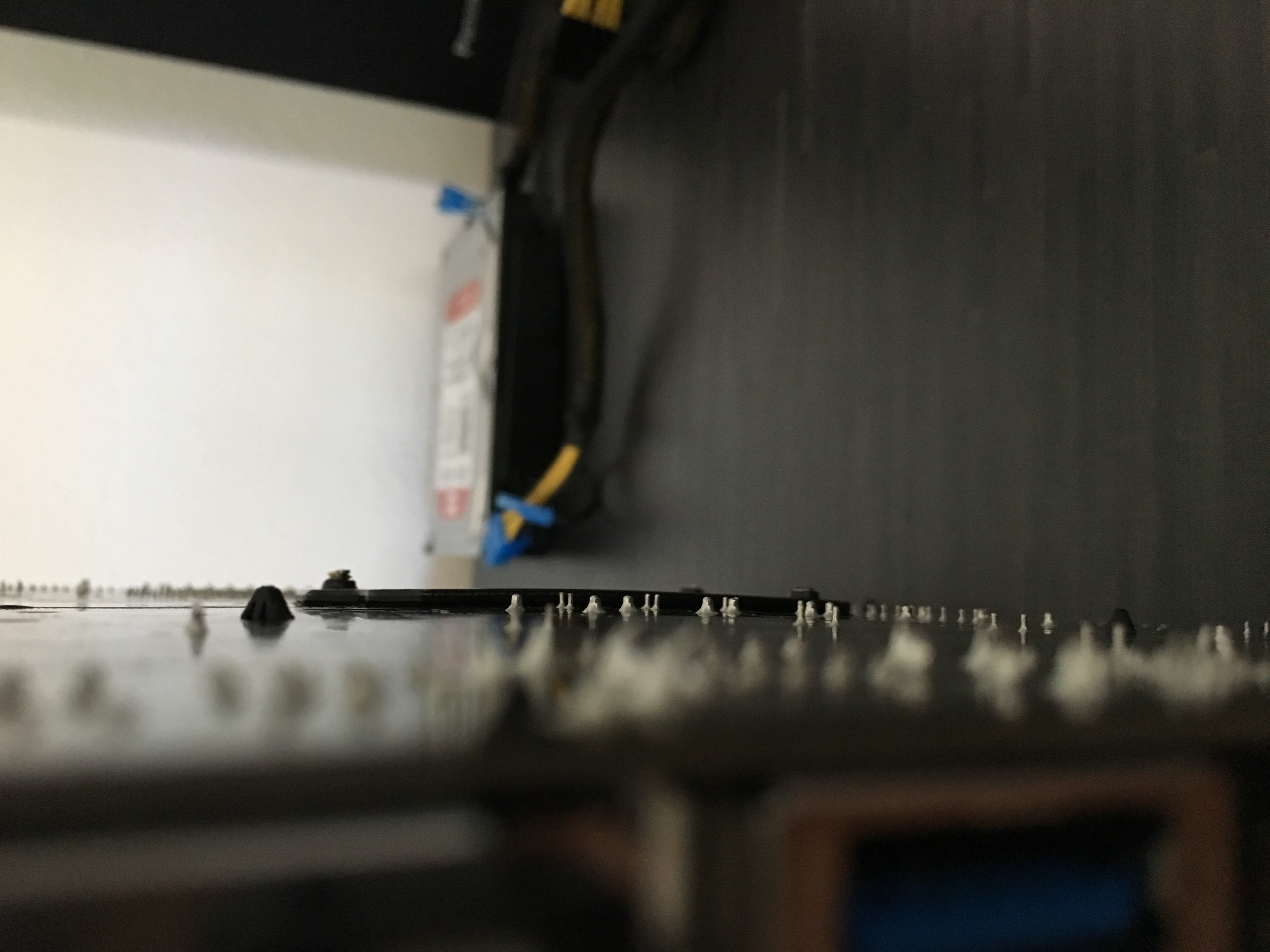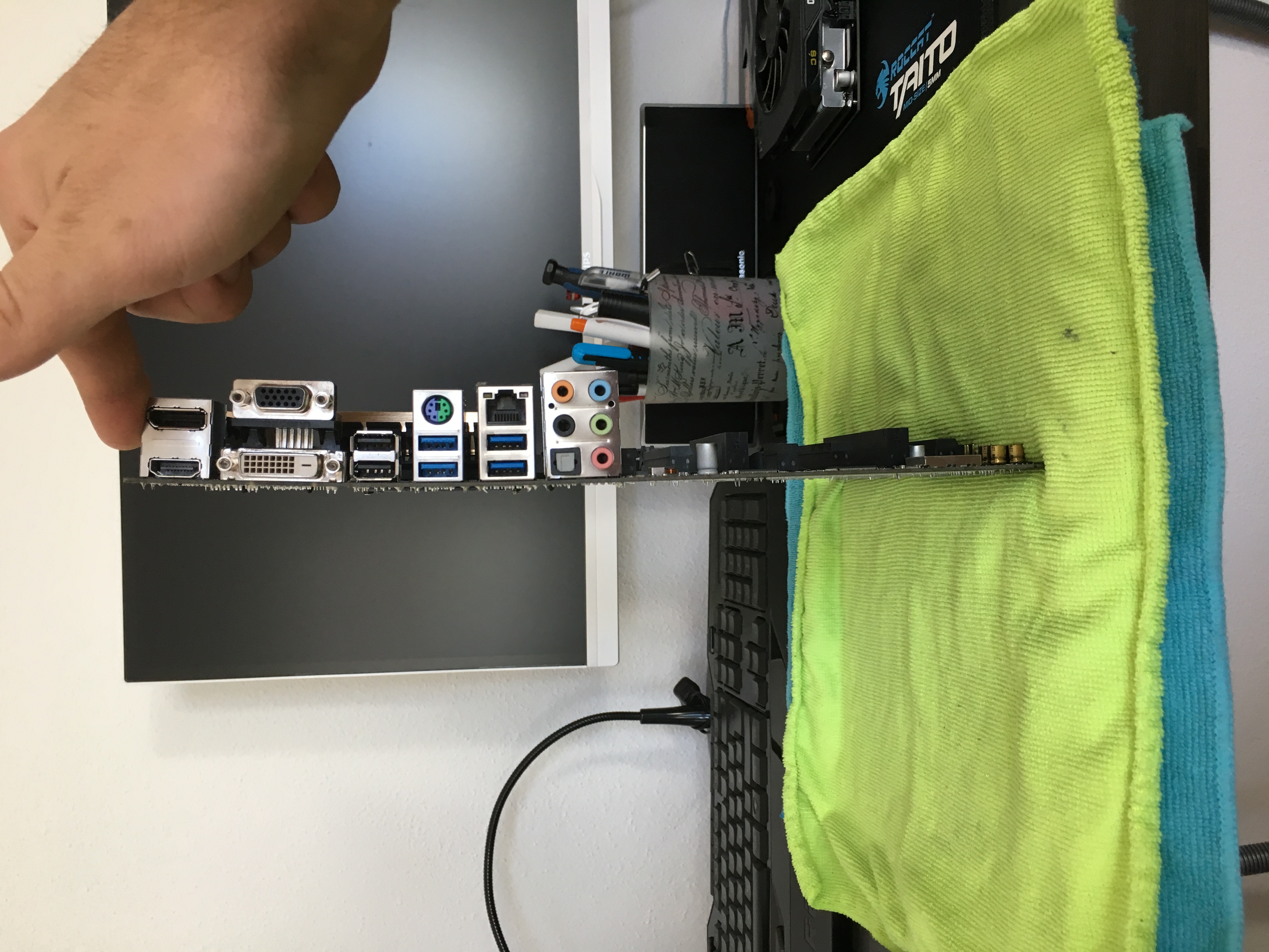 Den Kühler den pc hat mir damals ein Kollege zusammen gebaut und hat so wie ich das sehe nicht bemerkt das eine Schraube vom CPU Sockel hinten am mainboard über steht und somit die kühler Backplate das ganze mainboard verbogen hat.