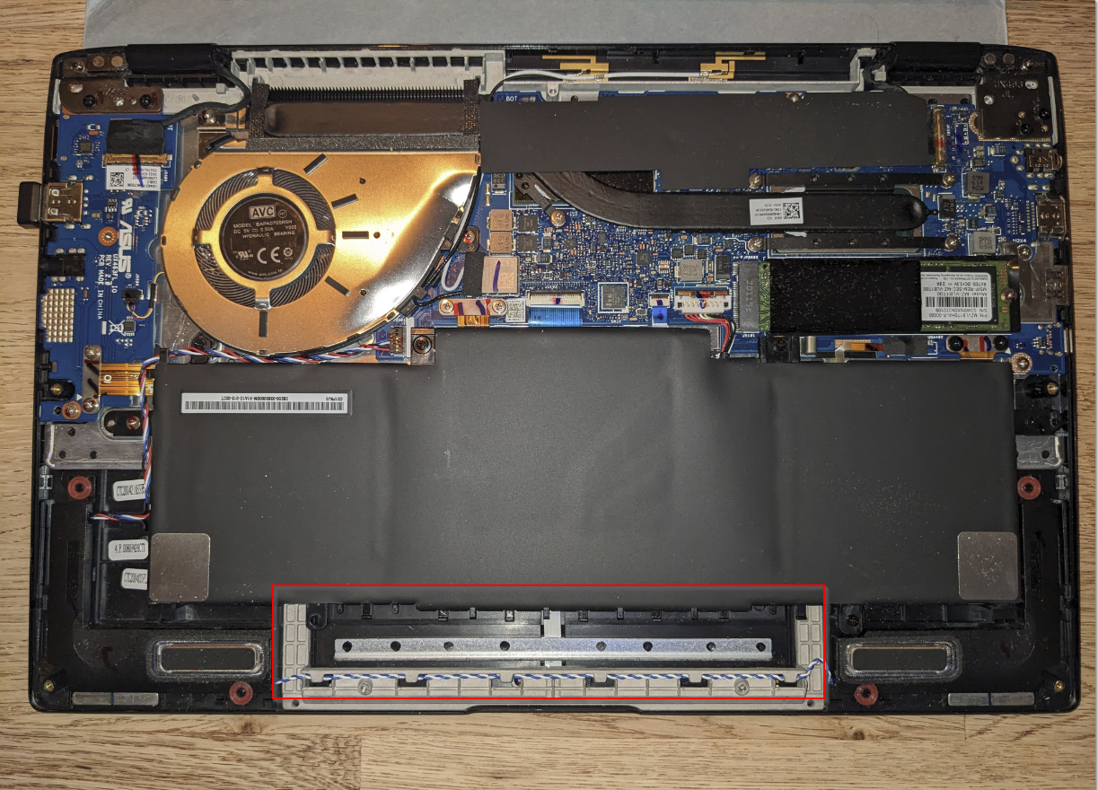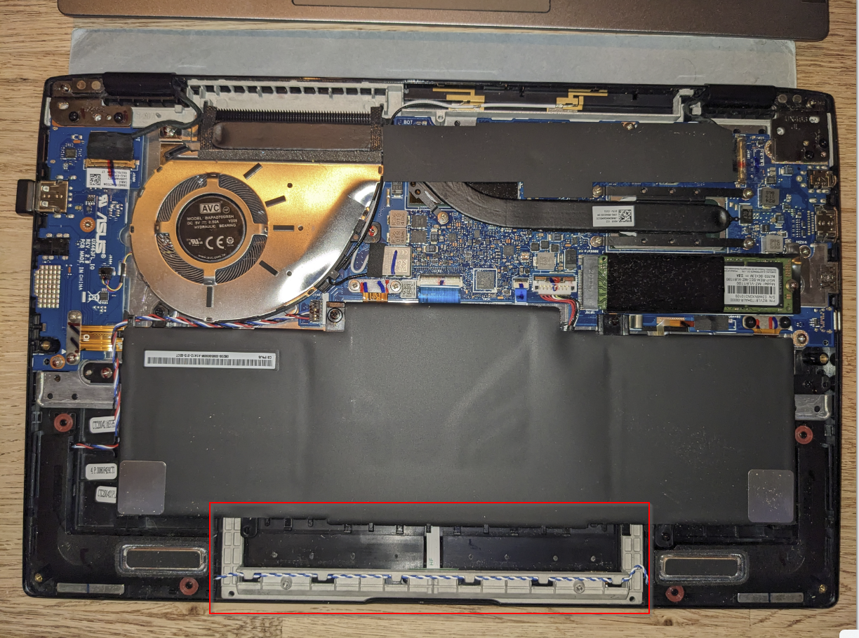 wer kann mir helfen? Mit ist ein Gegenstand auf das aufgeklappte Notebook gefallen (fragt nicht...). Danach hat es im Gehäuse furchtbar geklappert. Ansonsten funktioniert alles weiter einwandfrei. Dennoch wollte ich wissen, was sich da gelöst hat. Es handelt sich um eine kleine Metallschiene, die anscheinend mit Kunststoffpunkten von unten am Touchpad "festgelötet" war. Siehe Bilder. Ich habe das Ding jetzt einfach rausgenommen, da es eh komplett gelöst war und ich auch nicht weiß, wie ich es wieder befestigen sollte.