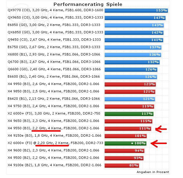 Im bild erkennst du zudem, das der Phenom trotz signifikanter Änderungen im Cache-System kaum schneller ist als ein alter X2 Atlhon bei selben Takt. (Unter Spiele bezogen)