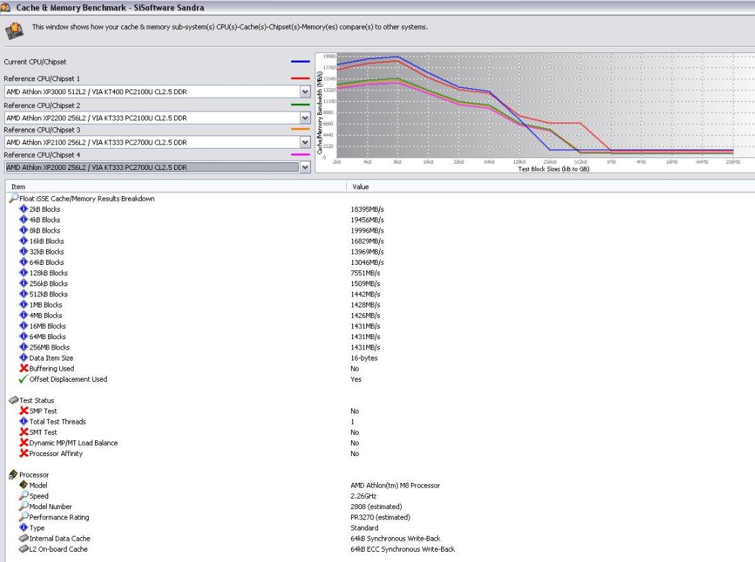 Dann solltest du nen Abfall der Performance bei 64kb (l1 auf l2) und einen Abfall bei 320 (l2 auf ram) feststellen. Wenns anders ist, dann stimmt da wohl was nicht.