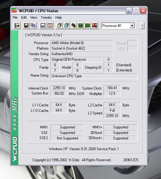 ich habe mir vor kurzen einen AMD Athlon XP 1700+ gekauft. Der mit dem JIUHB Stepping. Also der extrem gut zu übertakten sein soll. Der läuft auch im Moment mit 2250 MHz. Aber das Problem ist, dass die CPU bei mir nur als "Unknown CPU Type" erkannt wird. Im Bios steht das und in den üblichen Informationsprogrammen: Sisoft Sandra, WinCPUID, Aida und in den Tools von AMD. Das allein wäre ja auch nicht so schlimm. Aber in den Programmen steht auch, dass der L2-Cache meiner CPU lediglich 64 KB beträgt, obwohl er ja 256 KB haben sollte. L1-Cache sind normal 2x 64 KB =128 KB.