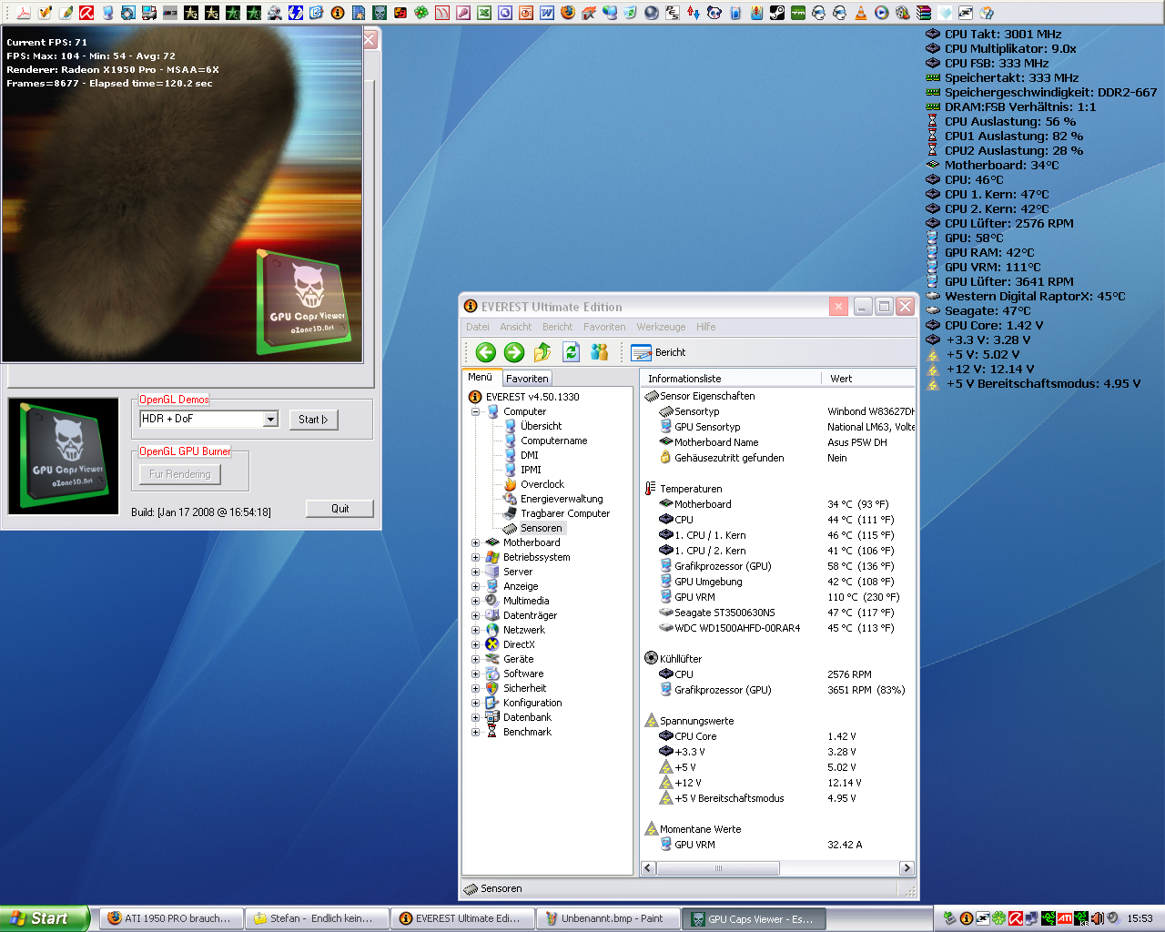 Ich habe Everest auf gemacht und die Sesoren auslese ging los, dabei hab ich fast ein schlag bekommen, der GPU VRM ist bei normalen Betrieb bei 52 Grad und 10,16 A (Zimmer gute 25 Grad), was aber nicht soschlimm ist, dann habe ich ein GPU Stresstest angemacht (GPU Caps Viewer = kann ich nur weiterempfehlen das Programm). Nach gut 3min wa der GPU VRM von 52Grad auf 110Grad angestiegen und die 10,16A waren bei 33,06A. Wenn nun viele denken die Sensoren würden nicht richtig ausgelesen, ich habe die neuste Version von Everest drauf und meine Karte würde bei 3 verschiedenen Rechner getest.