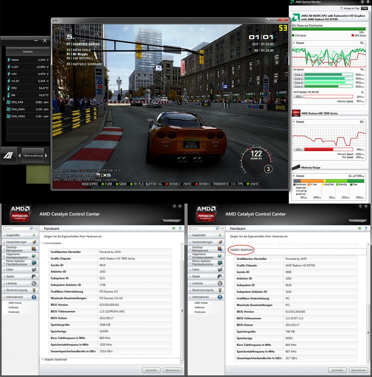 Steck nen Monitor drann, erweitere den Desktop drauf. Oder bist Du auf das Zusammenarbeiten der beiden aus? Hybrid CrossFireX nennt sich das dann.