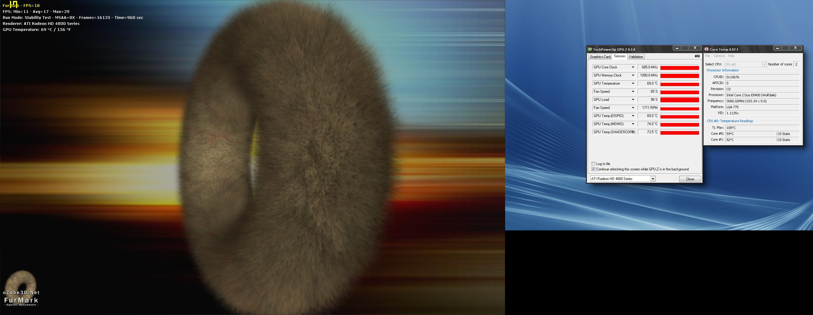 Um unter Last die maximale Temperatur bei Volllast, bei der minimalsten Drehzahl die geht, zu erreichen, teste ich 960 Sekunden Furmark 1.4.0. - Drehzahl und Temperatur halten sich dann in Waage. Auf einem 2. Monitor habe ich im Hintergrund GPU-Z und Coretemp laufen.