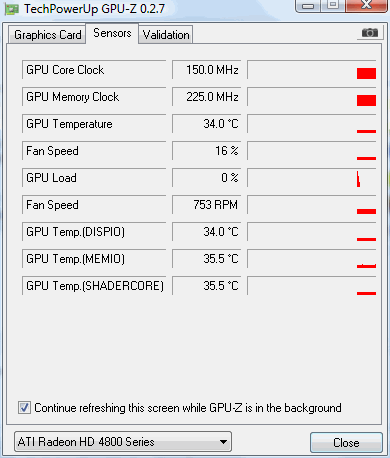 Bei mir ist ne Gainward HD4850 Golden Sample verbaut, die im idle mit 150/225 läuft. der lüfter dreht mit 750rpm und ist für meine verhältnisse nur zu hören wenn man den kopf an das gehäuse drückt.