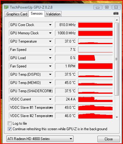 Die Karte taktet sich im 2D Betrieb auf 500/950 Mhz runter. Fan Speed beträgt 7% und die Temperaturen bleiben bei Konstanten 42°.