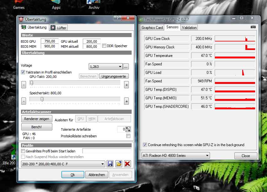 Wenn ich unter Hardware->Übertakten manuell Taktraten festlege und als Profil abspeichere wird der Wert nach einem Neustart verdoppelt. Sprich aus 500/900 wird 500/1800. Beim Anwenden dieses Profils wird logischerweise der Bildschirm schwarz. Den Haken unter DDR-Speicher hab ich rausgemacht weil er dann gleich den effektiven Wert anzeigt und ich Angst habe dass er dann auf beispielsweise 3600 mhz springt.