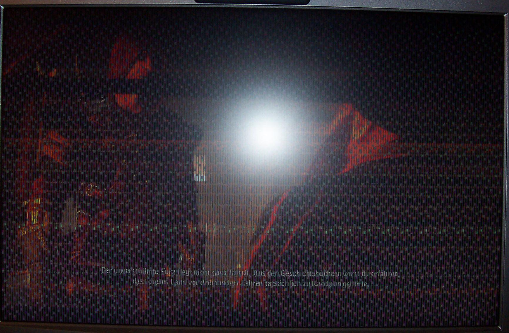 Dabei entsteht zuerst ein schrecklicher Bildfehler (siehe Anhang; PC friert meist ein), dann ein Blackscreen, der manchmal mit einem Bluescreen abgerundet wird.