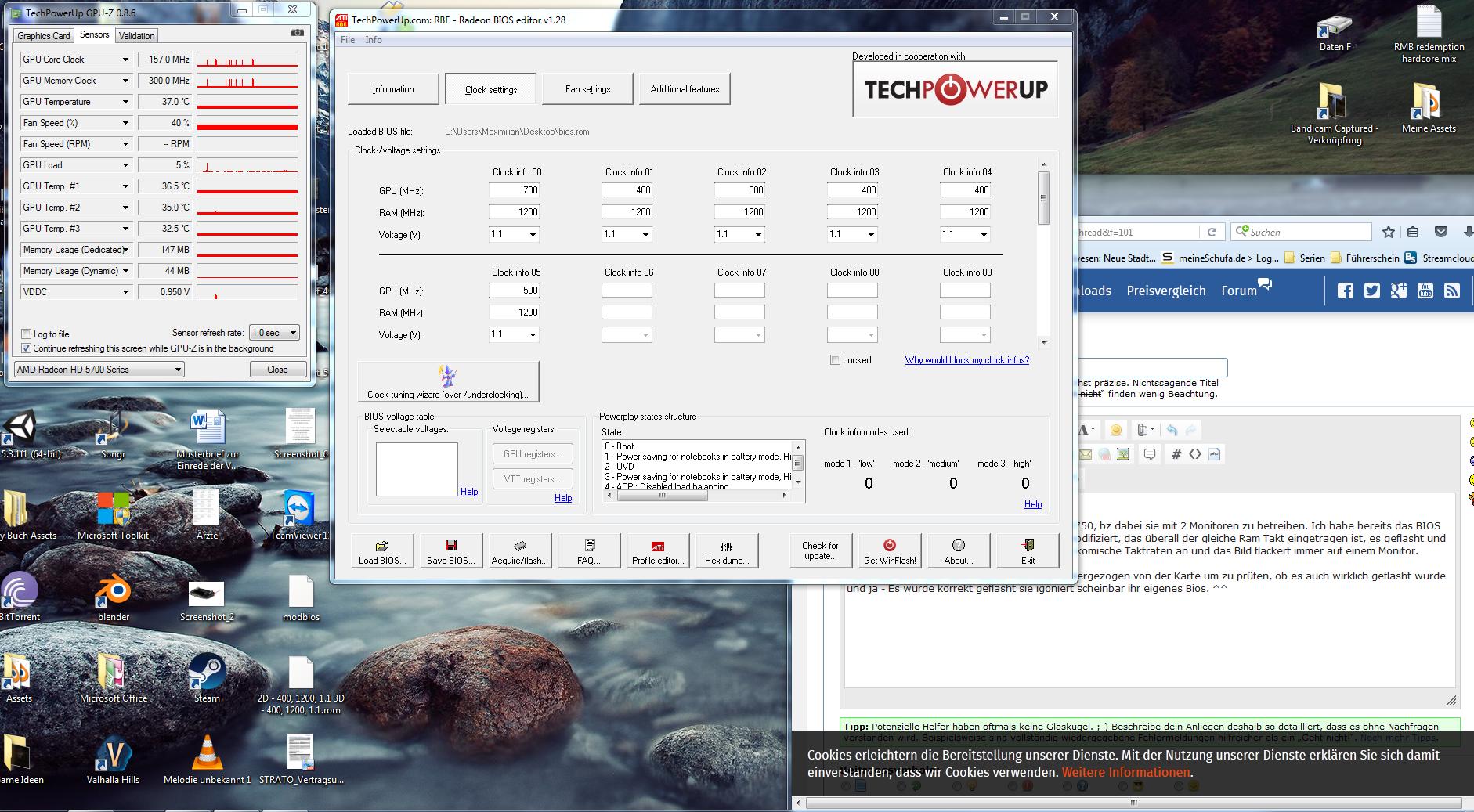 Habe immer noch ein Problem mit meiner HD 5750, bz dabei sie mit 2 Monitoren zu betreiben. Ich habe bereits das BIOS mit ATI Winflash runtergezogen, mit RBE so modifiziert, das überall der gleiche Ram Takt eingetragen ist, es geflasht und 2x neugestartet. Dennoch zeigt GPUz weiterhin komische Taktraten an und das Bild flackert immer auf einem Monitor.