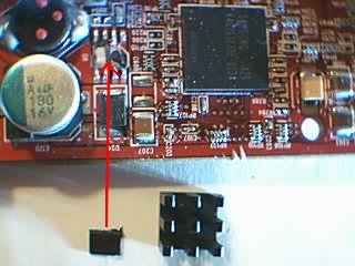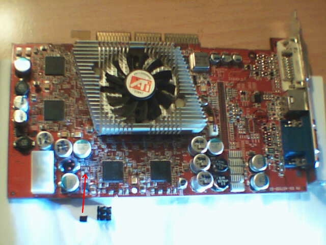 Der Baustein sitzt auf einer Grafikkarte ATI 9800 Pro und es ist ein Kühler aufgeklebt.