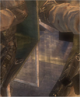 Ich finde das beides ziemlich hässlich und zermatscht, warum beschwert sich hier eigentlich kein Mensch über diese furchtbaren Texturen (Cockpitisntrumente und die Arme der Figuren, da fällt es besonders auf). Über beiden Bildern befindet sich ein unscharfes Leuchten. Weiterhin leuchtet die Landschaft ins Bild hinein.