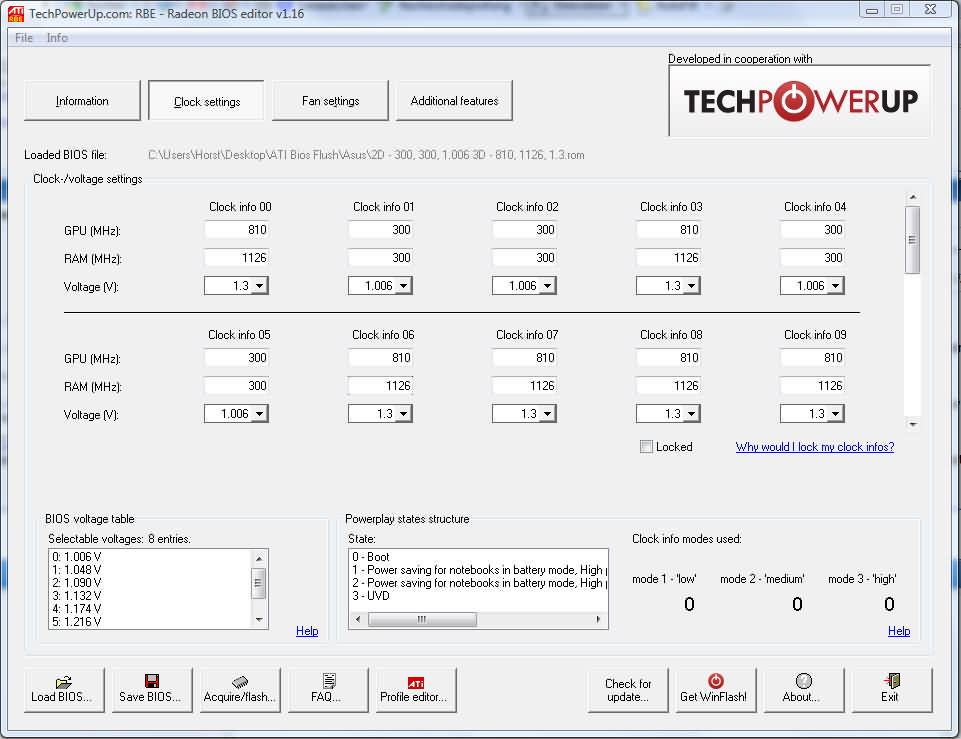 Ich hab mir das Biossetting für meine 2 Stk 3870 selber gebaut. Laufen Im 2 D mit 300 Mhz RAM takt und 300 Mhz GPU takt. Beim Normalen Bios taktete der RAM nicht runter. Und die GPU blieb immer auf 1,3 Volt. GPU läuft jetzt bei mir im 2 D bei 1.06 Volt normal warens 1,3 Volt im orginal Bios.