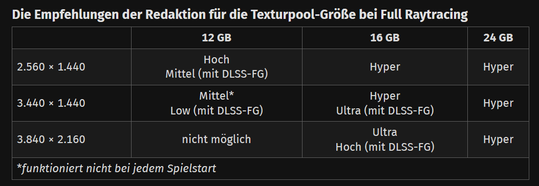 Ich hatte jedenfalls auf der 4080 in 4K mit DLSS Performance + FG, High Texturen und dem Rest incl. pathtracing maxed out keinerlei Probleme.