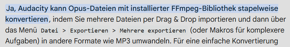 --> wenn ich unabhängig davon mehrere Dateien in Audacity reinziehe und meherere als opus exporieren will fehlt auch die Option opus.