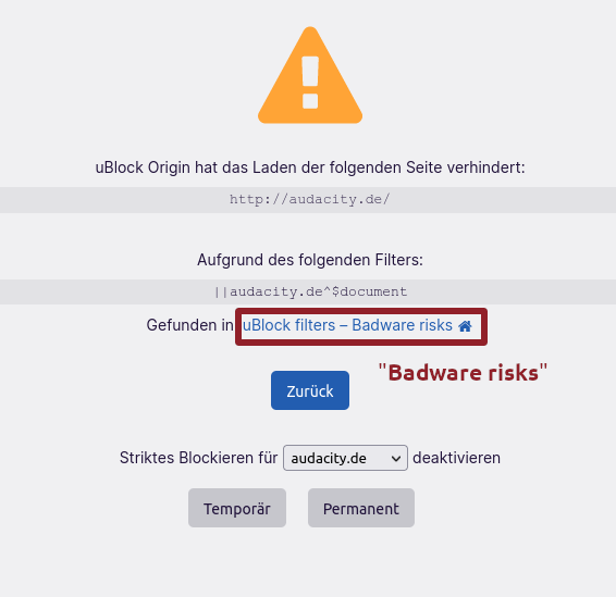 übrigens.... überdenke mal den sinn von avira. der windows eigene virenschutz reicht, inklusive ublock origin. dieser kennt die audacity.de seite und warnt vorher mit einem sehr grossen hinweis......