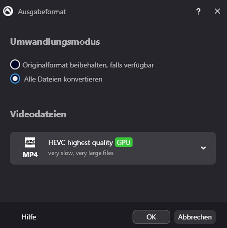 Würde gerne mehr über die unterschiedlichen Videoeinstellungen für mp4 in Audials one erfahren. Mir sind nicht unbedingt die Unterschiede bekannt, die man am besten für eine Aufnahme für Amazon Video etc. gebraucht. Was ist die beste Einstellung, die ihr empfehlen könnt? Und ich verstehe den die als Datei angehängte Auswahl nicht, Original-Format und "Alle Datein konvertieren" nicht. Was ist der Unterschied zwischen der Einstellung H.264 und HEVC? Vielleicht habt ihr einen Link für mich, der das ganze erklärt? Besten Dank!