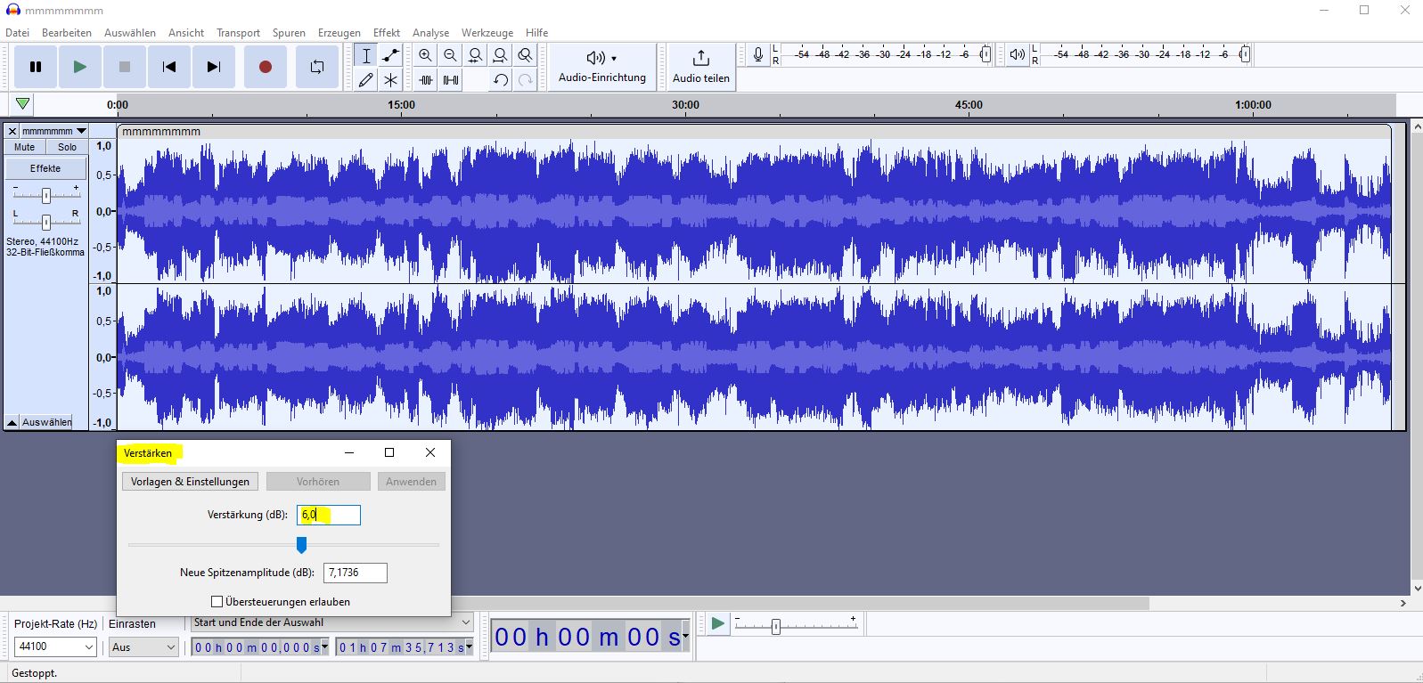 Die erste ist die "Normalisierung" (in Audacity gibt's bestimmt einen entsprechenden Menüpunkt). Verändert den Klangcharakter nicht sondern hebt alle Frequenzen soweit an, dass die lauteste Stelle gerade noch nicht übersteuert. Falls möglich. Normalisierng => 0 db, Vollaussteuerung. Ohne clipping.