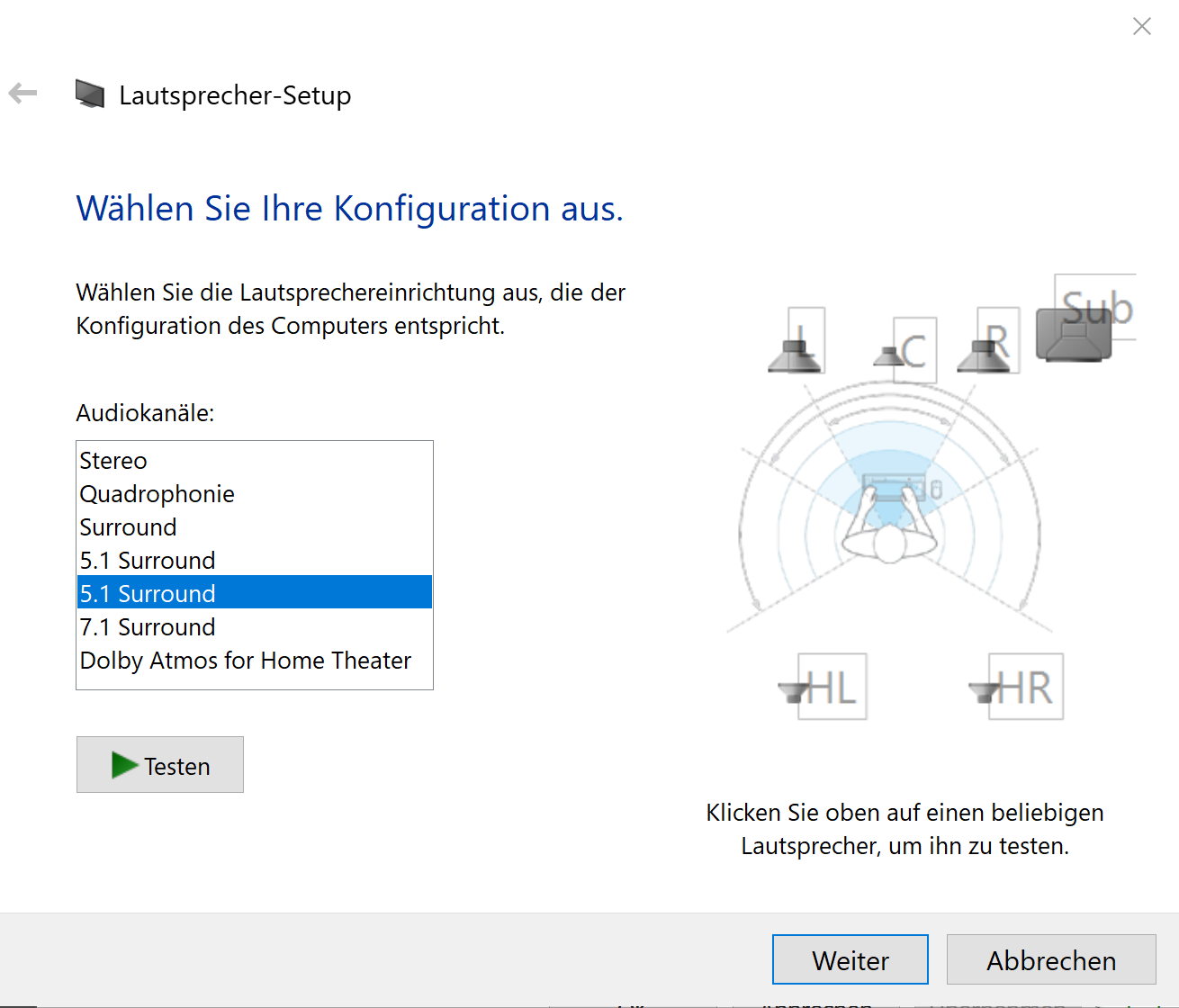 In den Windows Sound-Einstellungen kann ich bei NVIDIA High Definition Audio lediglich Stereo auswählen. NVIDIA deswsegen, weil Audio über HDMI ausgegeben wird.
