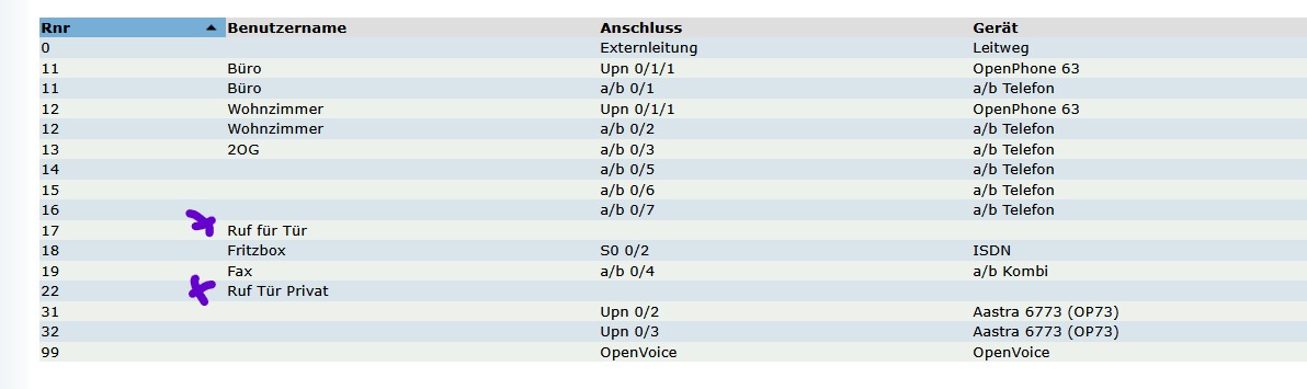 Die TFS hat zwei Nebenstellen, diese sind auf die Nummern 17 und 22 programmiert (siehe Screenshot).