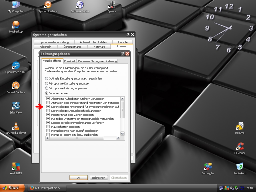 -Rechtsklick auf Desktop -> Und dann wiederr auf Windows Klassik XP umgestellt. wenn ich dann aber das Hintergrundbild wieder rein mache, dann kommt das wieder. Der Hintergrund der Schrift unter den Symbolen ist nicht transparent.