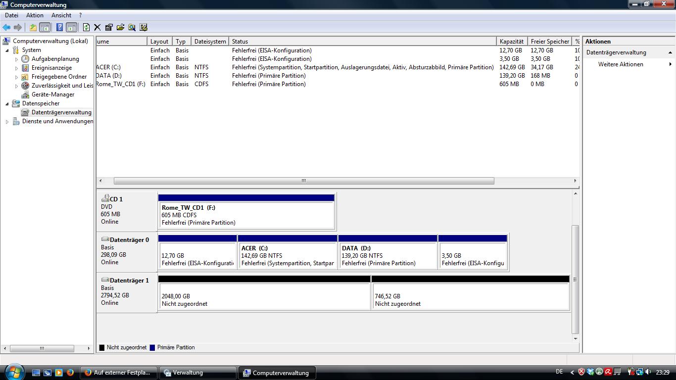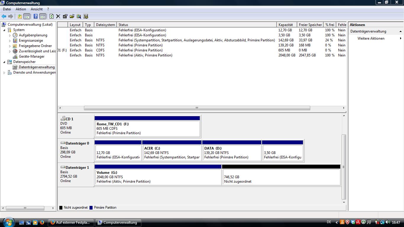 ich habe ein Problem. Habe mir eine neue externe 3TB Festplatte gekauft und wollte diese in 3 jeweils 1 TB große Festplatten unter Windows Partitionieren. Habe wohl Mist gebaut und meine Festplatte wird unter Computer mit 2 TB angezeigt. Unter der Datenträgerverwaltung von Windows habe ich nochmal 746 Gb nicht zuordneten Speicherplatz auf der Festplatte.