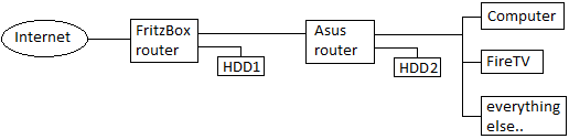 Was ich nun möchte ist, dass ich mit dem Rechner und dem FireTV auf die HDD1 zugreifen kann, die an der FritzBox hängt. Dazu muss ich ja durch den Asus-Router irgendwie durch. Ist das möglich bzw. was müsste man dann im Asus-Router einstellen, damit die HDD1 auch in meinem Netzwerk sichtbar ist?