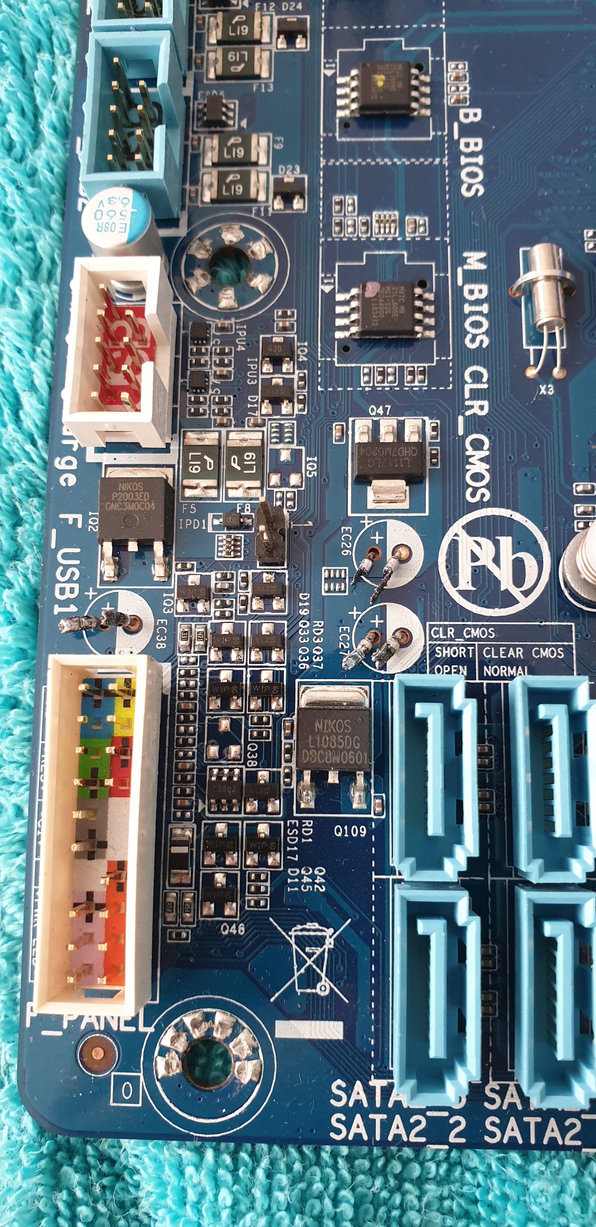 Sobald der PC länger als 1 Stunde aus war kam erneut das selbe Fehlerbild. Mein Gedanke ist, dass Kondensatoren defekt sind. Habe also ein neues Netzteil eingebaut. Erfolglos. Fehlerbild weiterhin anstehend. Ich entschied mich, den PC komplett auseinander zu nehmen und mir die einzelnen Bauteile zu begutachten. Optisch keine Mängel außer dass auf dem Mainboard Kondensatoren fehlen. Zumindest meine ich, dass es Kondensatoren sind. Für mich sieht es aus, als hätte der vorbesitzer gezielt die Kondensstoren ausgelötet! Schaut euch bitte das Bild an. Oder vertue ich mich? Ist das vielleicht normal das an den Stelle Kondensatoren fehlen? Für mich eigentlich eindeutig weil auch die Kondensatoren keine angeschmort und umgeknickt sind. Hat da jemand Erfahrungen mit gemacht und kann mir sagen wieso man sowas macht?