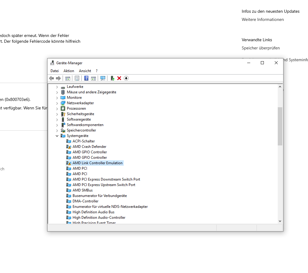 Unter "Geräte-Manager" > "Systemgeräte"> habe ich zwei Ausrufezeichen bei "AMD Crash Defender" und "AMD LINK Controller Emulation" gefunden. Ich habe mit DDU alle AMD-Treiber entfernt, allerdings konnte keine neuen AMD wieder installieren.