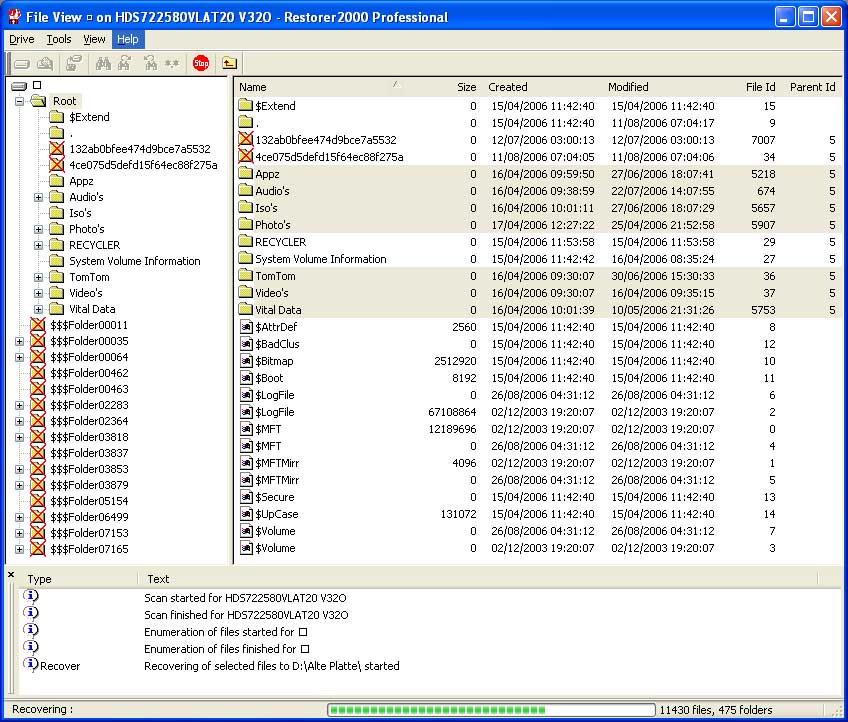 Hinterher kannst du oben im rechten Fenster in Restorer auf die Festplattensymbole (erkannte Partitionen) klicken und auf deine Daten untersuchen.