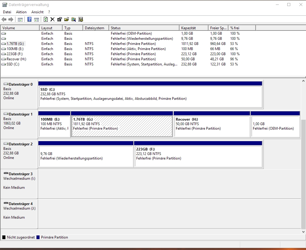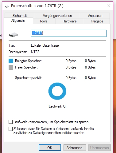 Die Partition ist nach wie vor da und auch die Größe ist korrekt aber das LW G: wird mit 0Byte angezeigt.