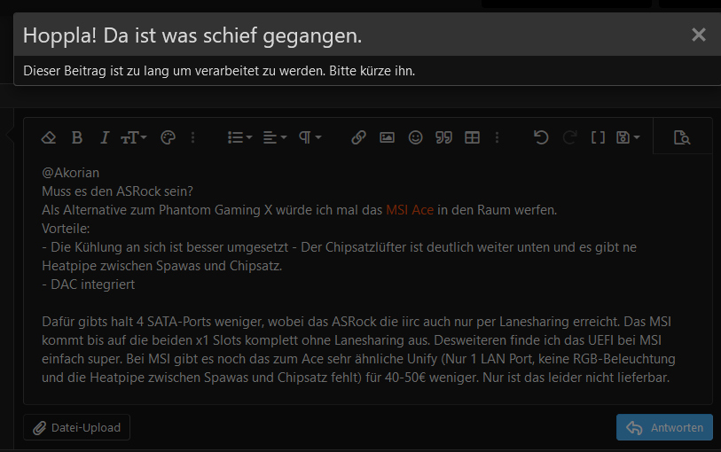 PS2: Hätte fast Lust noch nen Thread zu eröffnen... Warum ist der Beitrag zu lang um veröffentlicht zu werden? Der scheint mir kürzer als der vorhergehende Beitrag... Beitragstext im Spoiler. Konnte den Beitrag nun Posten, allerdings nur in Bruchstücken - siehe Edit-History des Beitrags