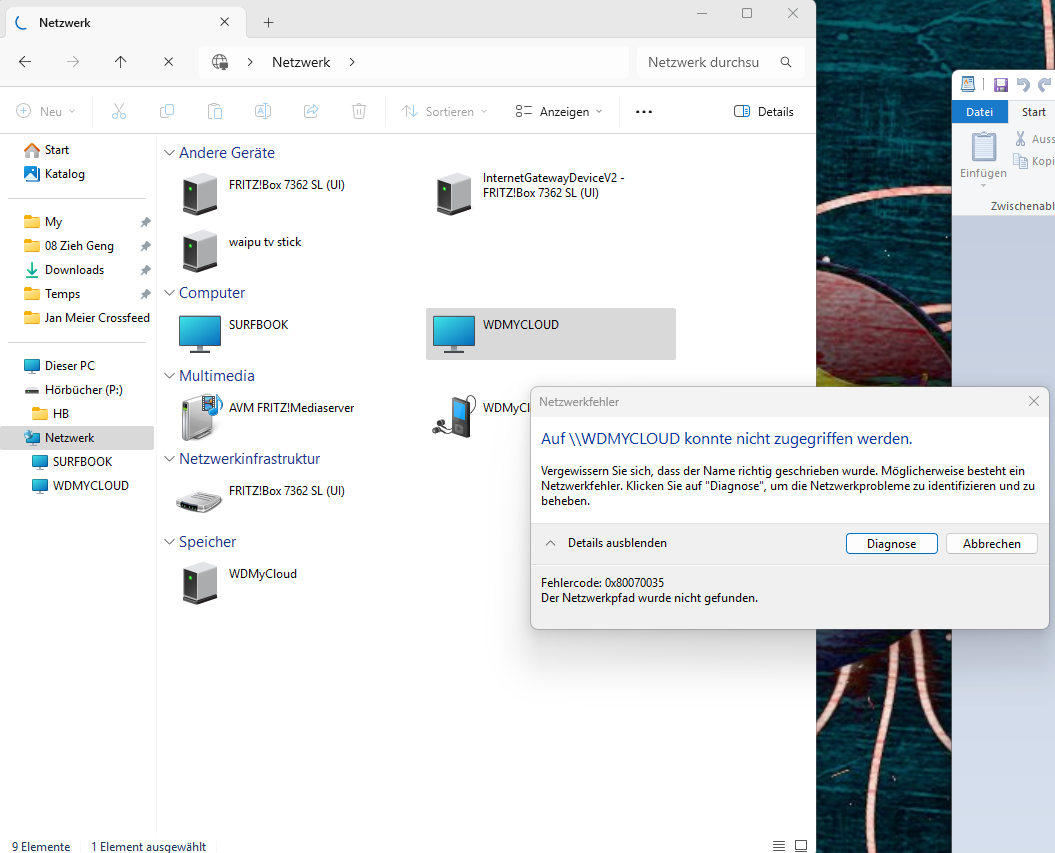 Ich habe eine kleine WD MyCloud Netzwerkfestplatte.Auf diese kann ich via Win11 Explorer nicht zugreifen (s.o. - Netzwerkpfad wurde nicht gefunden) - heisst: ich sehe sie im Explorer unter Netzwerk und unter Computer, bekomme aber den Error wenn ich darauf doppelklicke.