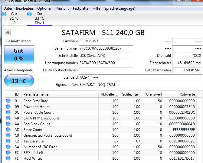 Weil ich es bei andern gesehen habe, habe ich noch eine Crystaldiskinfo gemacht. (2) (Die Werte bei "EIngeschaltet" und "Betriebsstunden" können definitiv nicht stimmen.)2.jpg