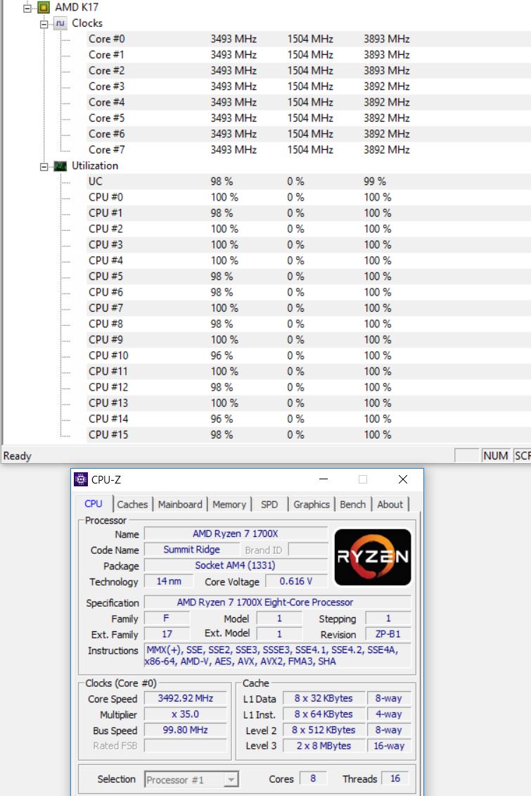 Wie in HWMonitor zu sehen, funktioniert XFR ohne Murren. Der Turbo über alle Cores geht bei Last auf knappe 3.50GHz.