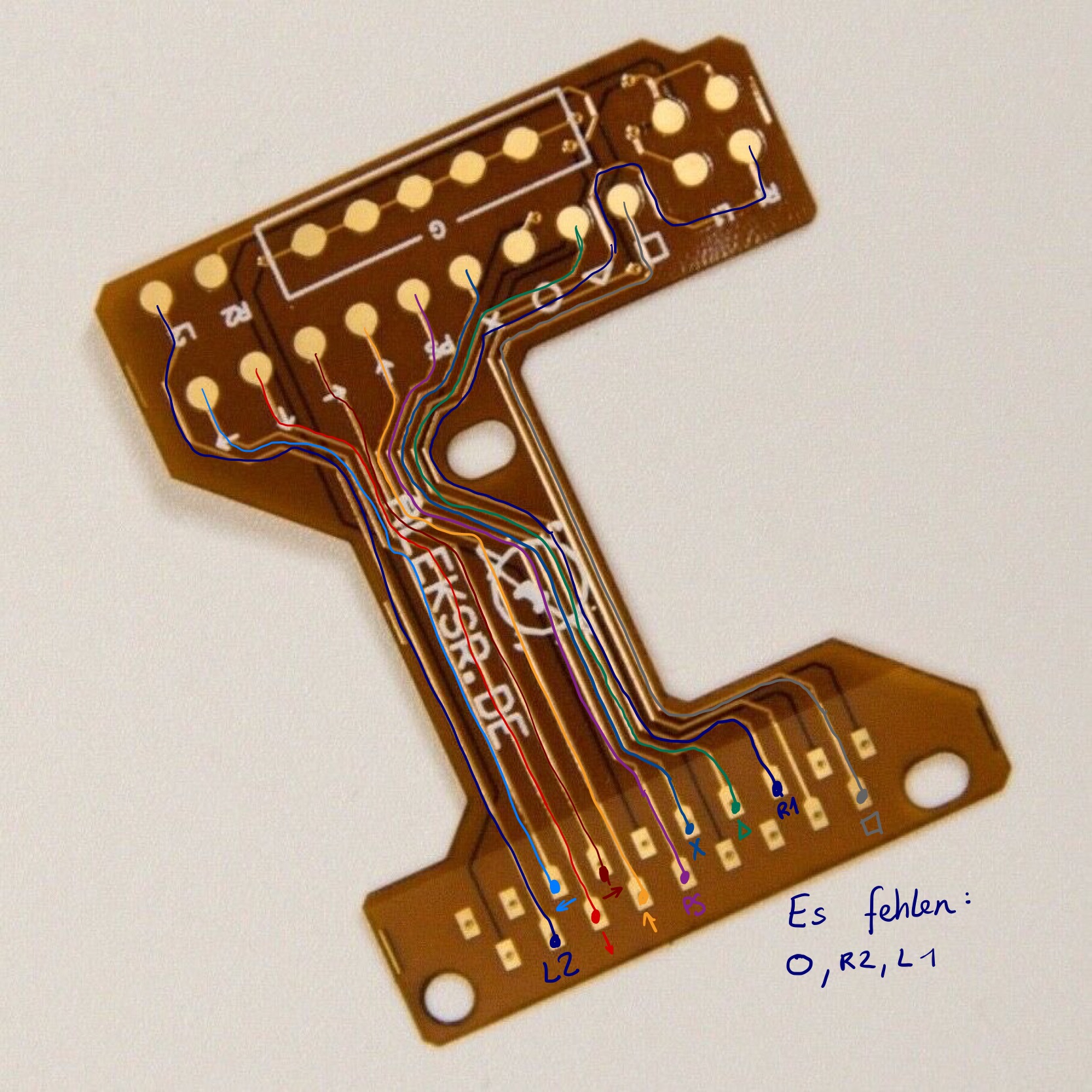 - Wieso geht eine Leitung von einem Pin durch mehrere Buttons wie z.B. der Pin neben (Pfeiltaste nach unten). Dieser geht durch die PS - Taste, danach durch X und O zu Dreieck, wo sie auch endet.