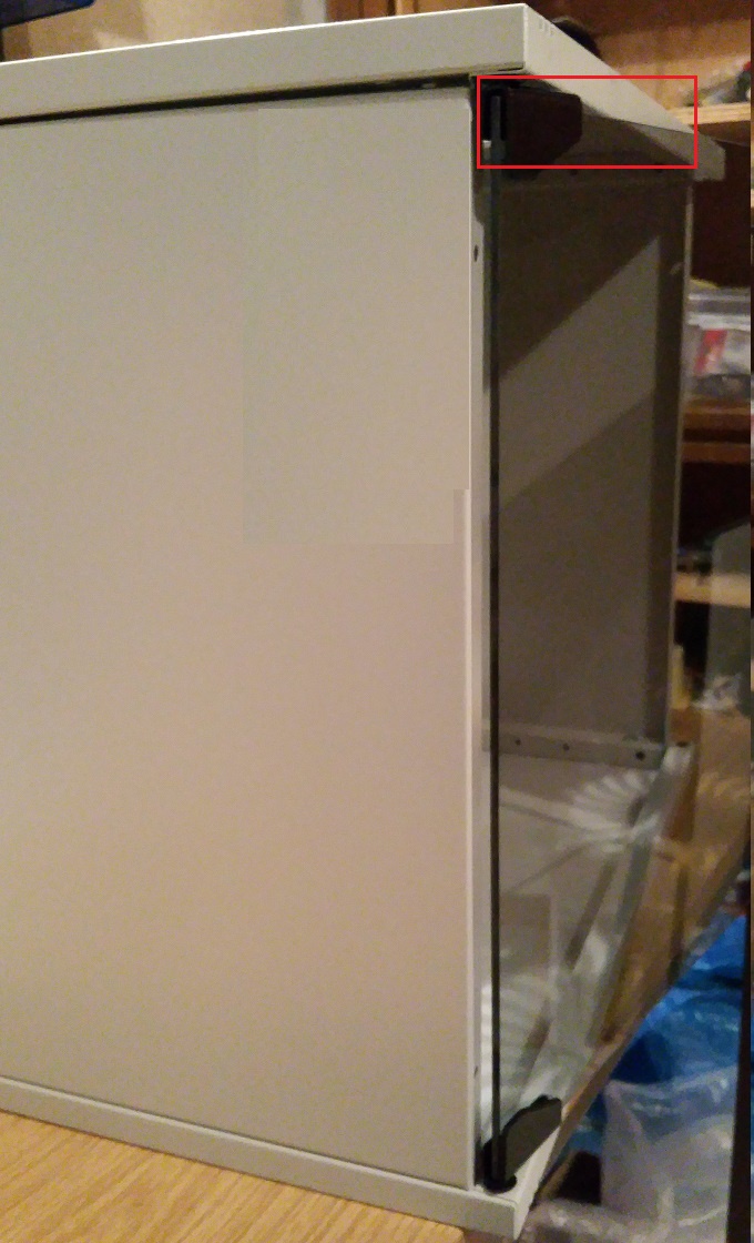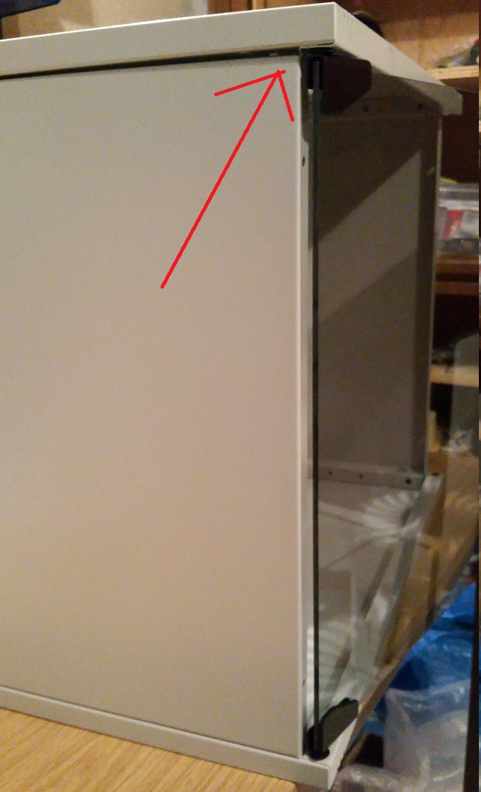 2) + 3) Da seht ihr die Schaniere. Innen drin ist ein Plastikschutz, durch den man die Schrauben ins Scharnier drehen kann ohne sie ins Glas zu drehen.
