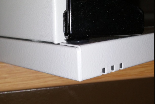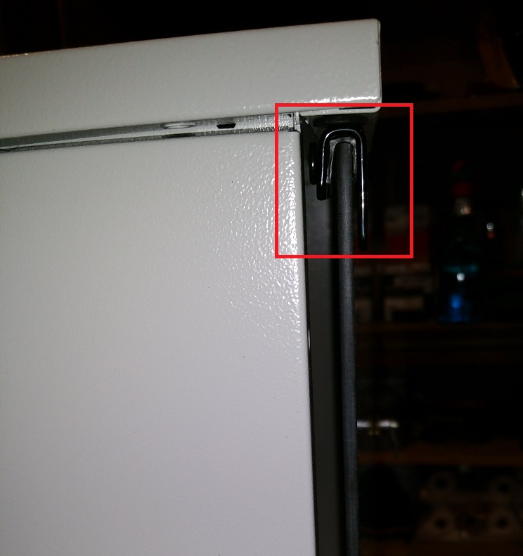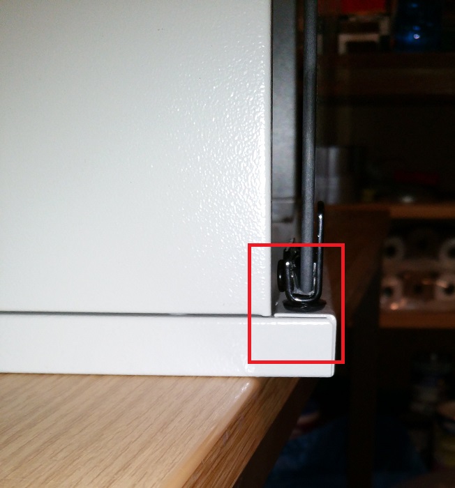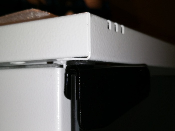 1) Da seht ihr das Gesamtergebnis. Nachdem ich die Tür eingesetzt habe, passt die Nase vom Seitenteil nicht mehr in den Deckel (im roten Rechteck oben links), da Tür+Schaniere einfach zu hoch sind.