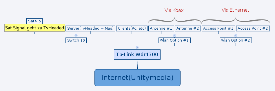 Unten im Keller, dem Verteiler raum(alle Kabel führen eig dahin) steht ein alter DLink Router welcher an welcher an die Unitymedia box angeschlossen ist also in etwa so. Beide Tp-Link Router haben OpenWrt drauf.
