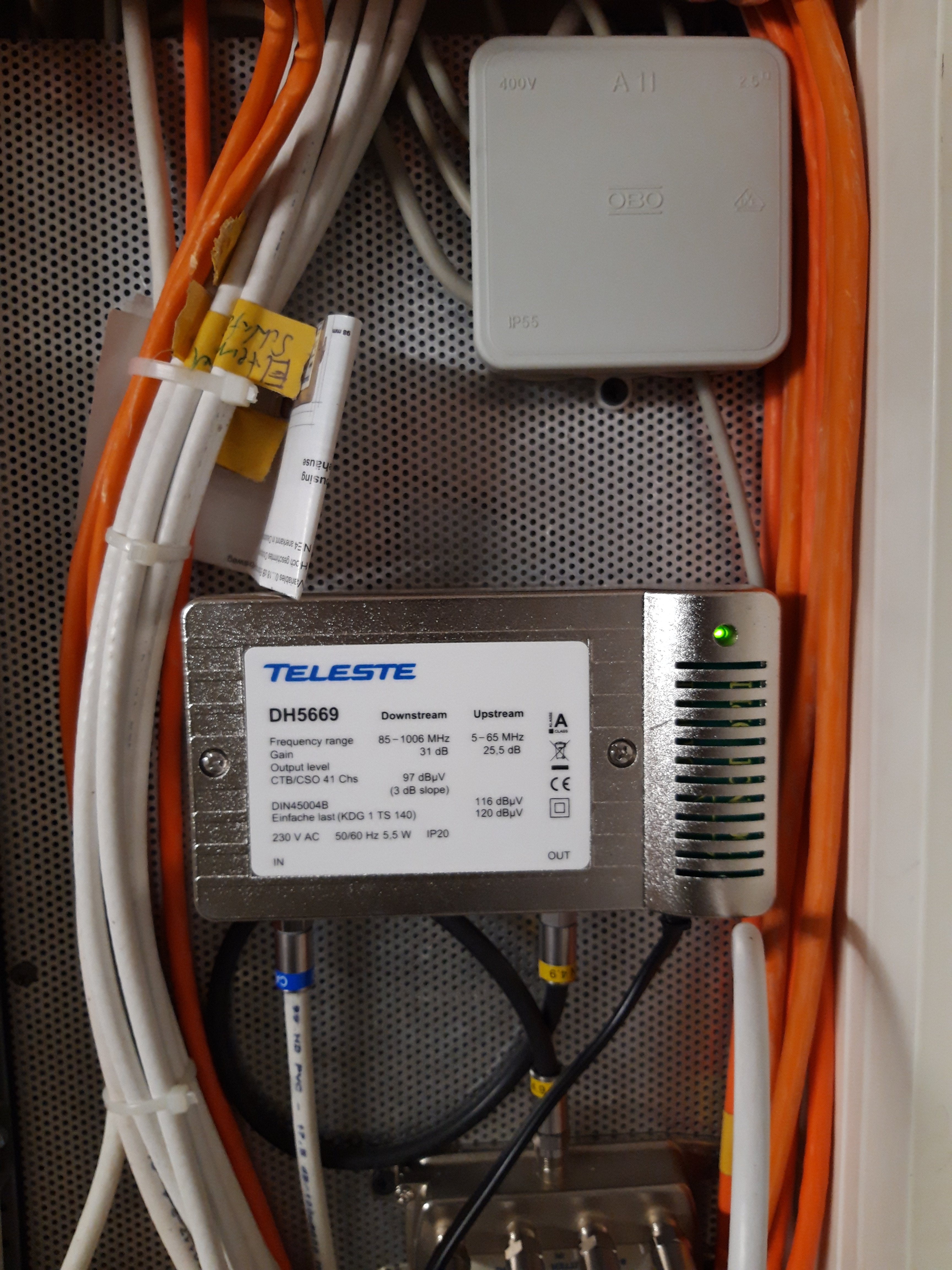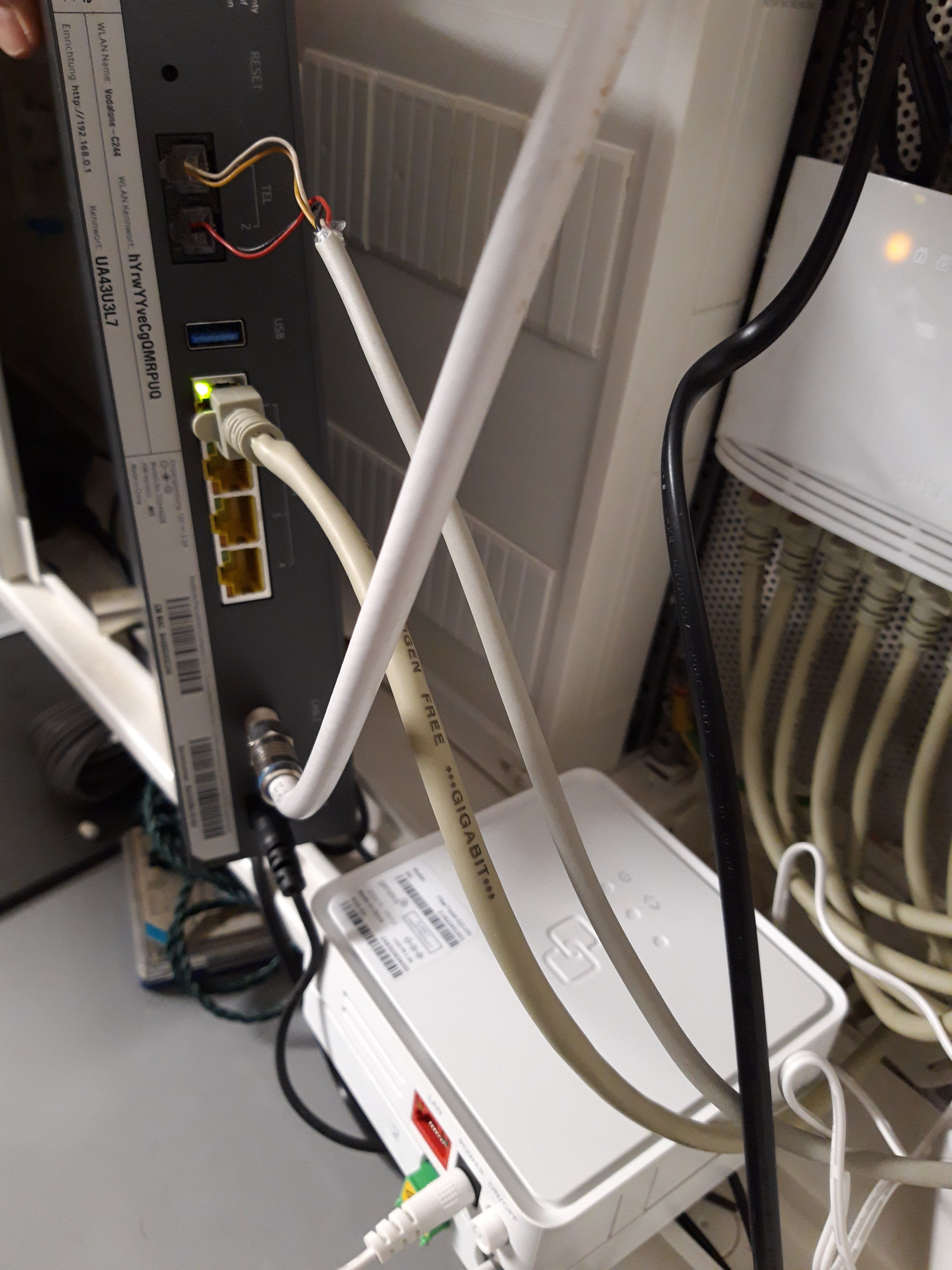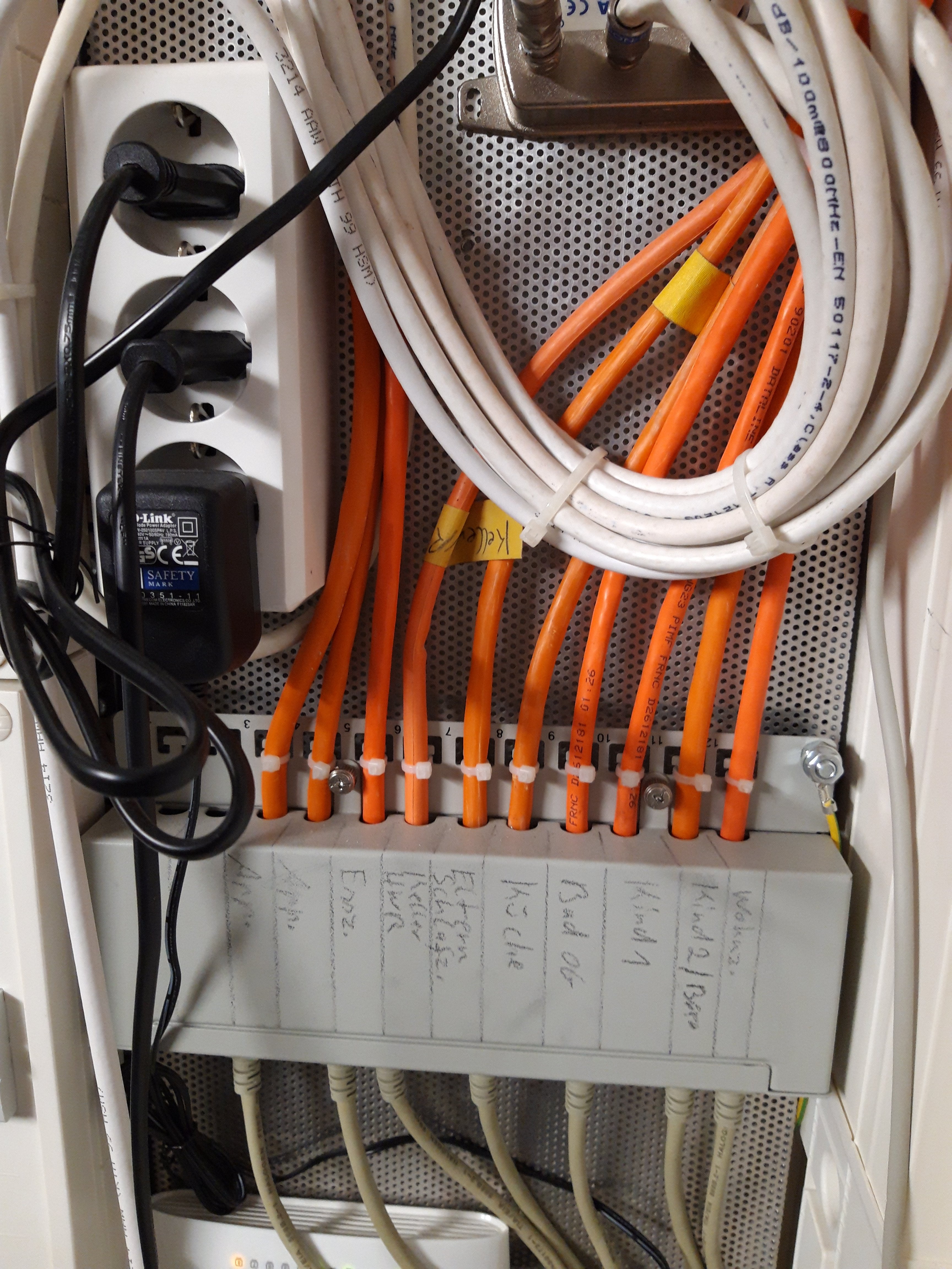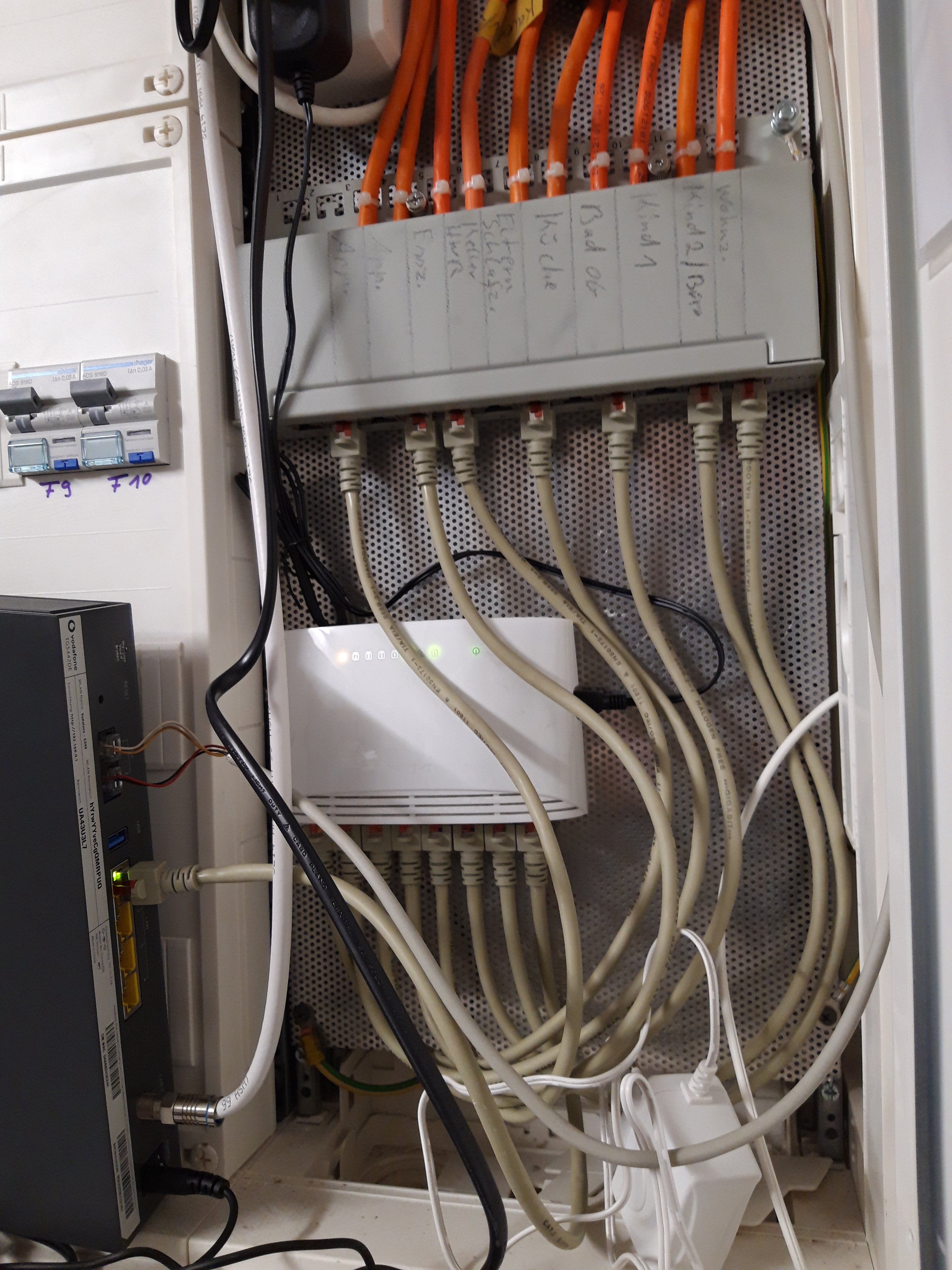 Aktueller Aufbau (siehe Fotos) in meinem Haus ist Kabelmodem - Switch - Patchfeld - LAN-Dosen in Wohnräumen - Fritzbox 7170. Als Technik-Analphabet habe ich versucht, das Glasfaser-NT statt des Kabelmodems direkt an Switch und Patchfeld anzuschließen, was aber kein Signal auf den LAN-Dosen gab.