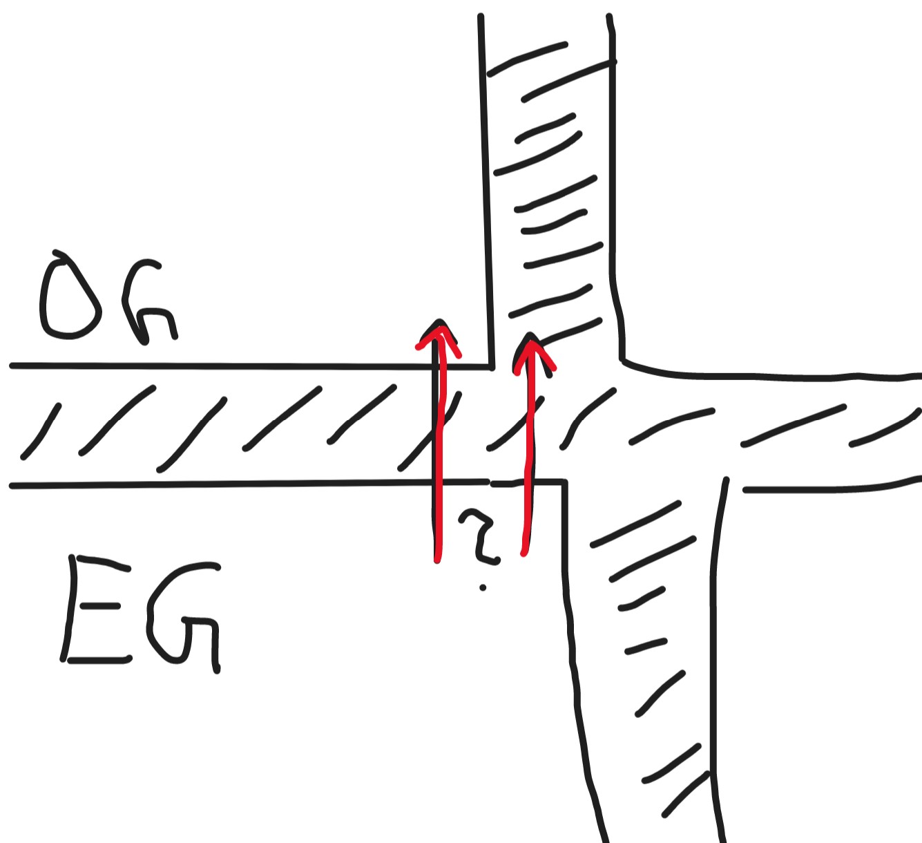 Nun habe ich das Problem, dass ich durch einfaches Messen den Bohrpunkt nicht präzise bestimmen kann, das heisst ich kann zwar bspw. von unten sagen "hier soll etwa das Loch hin", kann dann aber nicht exakt sicher sein, wo das Loch dann oben rauskommt, sprich es könnte passieren, dass ich dann IN der Wand oben rauskomme, statt daneben oder zu weit weg etc.. (siehe Skizze)
