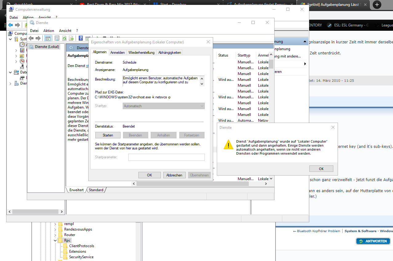 ich vermute, dass durch ein Systemwiederherstellungsprozess mein System (Betriebssystem: Windows 10 Home 64bit) aktuell beschädigt ist, und zwar möchte ich einen Grafiktreiber Update über NVIDIA Experience ausführen und bekomme prompt die Fehlermeldung das der Aufgabenplaner nicht aktiv wäre. Über Services.msc steht bei Aufgabenplaner aber alles auf Automatisch und "Wird ausgeführt". Wenn ich den Aufgabenplaner selbst aufrufen möchte bekomme ich eine Fehlermeldung "Der Dienst ''Aufgabenplanung'' auf ''Lokaler Computer'' konnte nicht gestartet werden.". Irgendwelche Ideen für einen Fix? Komplette Neuinstallation kommt nicht in Frage, da ein halbes Jahr Programm arbeit auf der Partition liegt.
