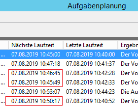 Wir haben Aktuell 6-9 Tasks die der Reihe nach ausgeführt werden sollen, und das dann aller 5 Minuten. Das ausführen aller 5 Minuten ist auch kein Problem nur schaffe ich es nciht das die Tasks der Reihe nach ablaufen sondern sich die Ausführungszeiten verschieben (siehe Bild), warum auch immer.