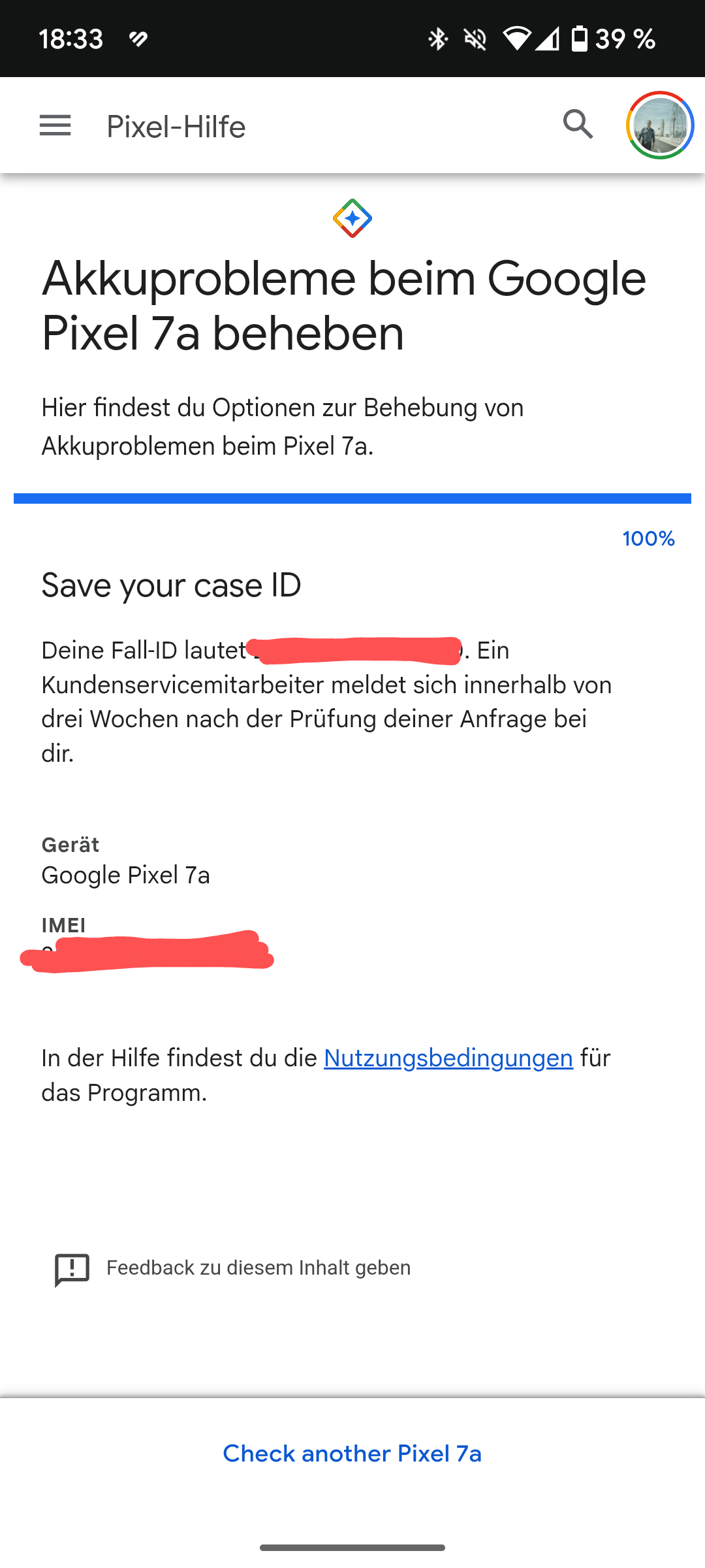 Mein Pixel 7a ist laut IMEI anscheinend auch betroffen. Der Akku ist allerdings augenscheinlich noch in Ordnung.